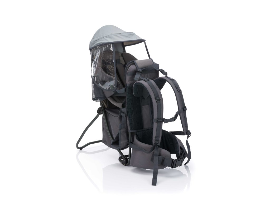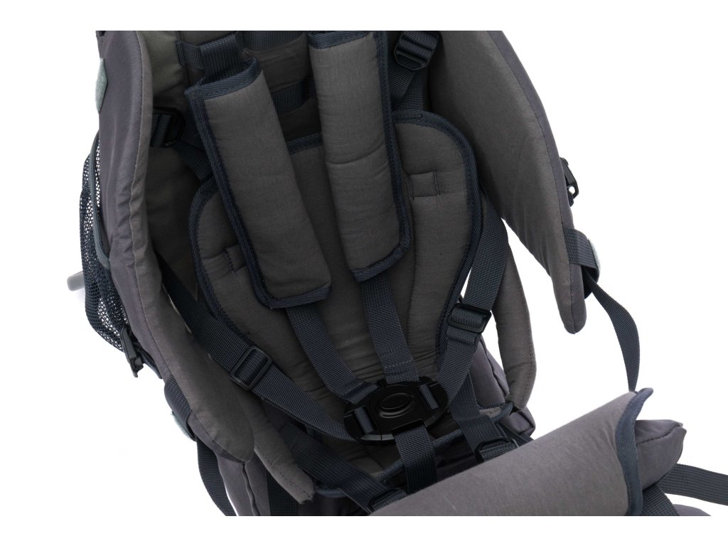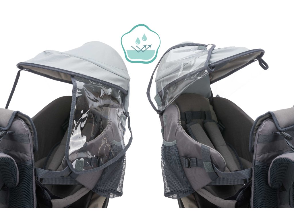 Všechny vnitřní části sedačky jsou měkké a pohodlně polstrované a všechny části popruhů jsou multifunkčně nastavitelné. Stříšky proti slunci a dešti se snadno připevňují a zajišťují optimální ochranu před všemi povětrnostními vlivy.
