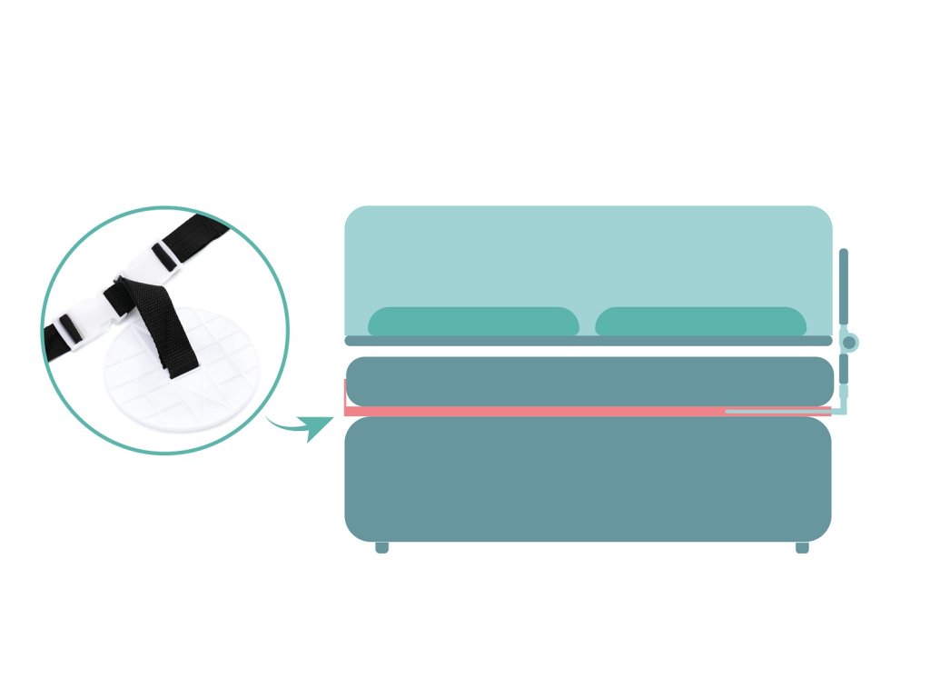 Při montáži stačí zábranu postele pouze nasadit na lamelový rošt, utáhnout bezpečnostní pás a položit matraci zpět nahoru. Pomocí speciální skládací funkce lze zábranu postele přes den sklopit a na noc opět postavit.