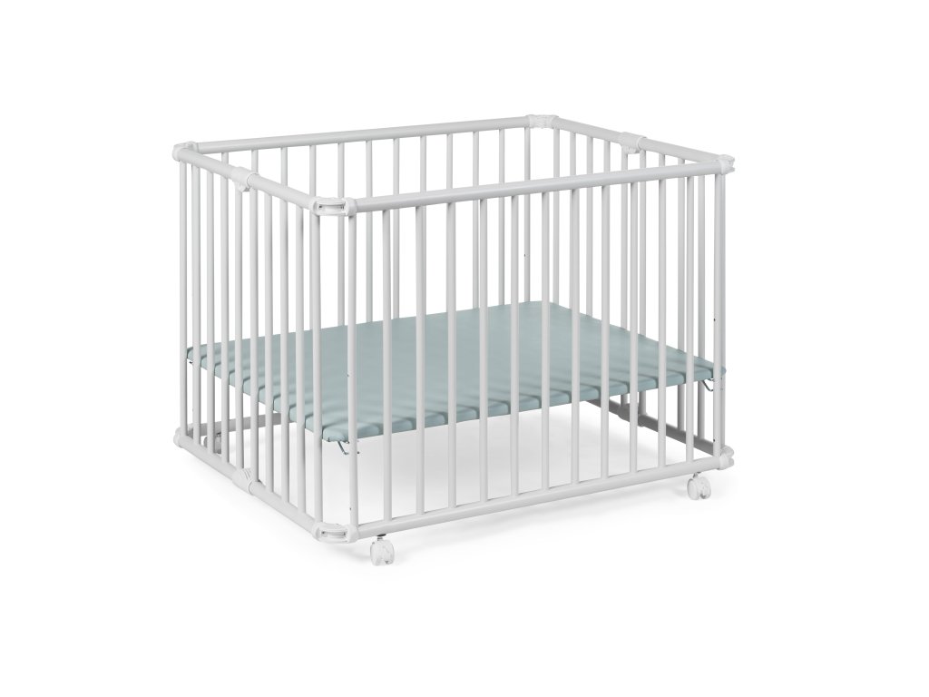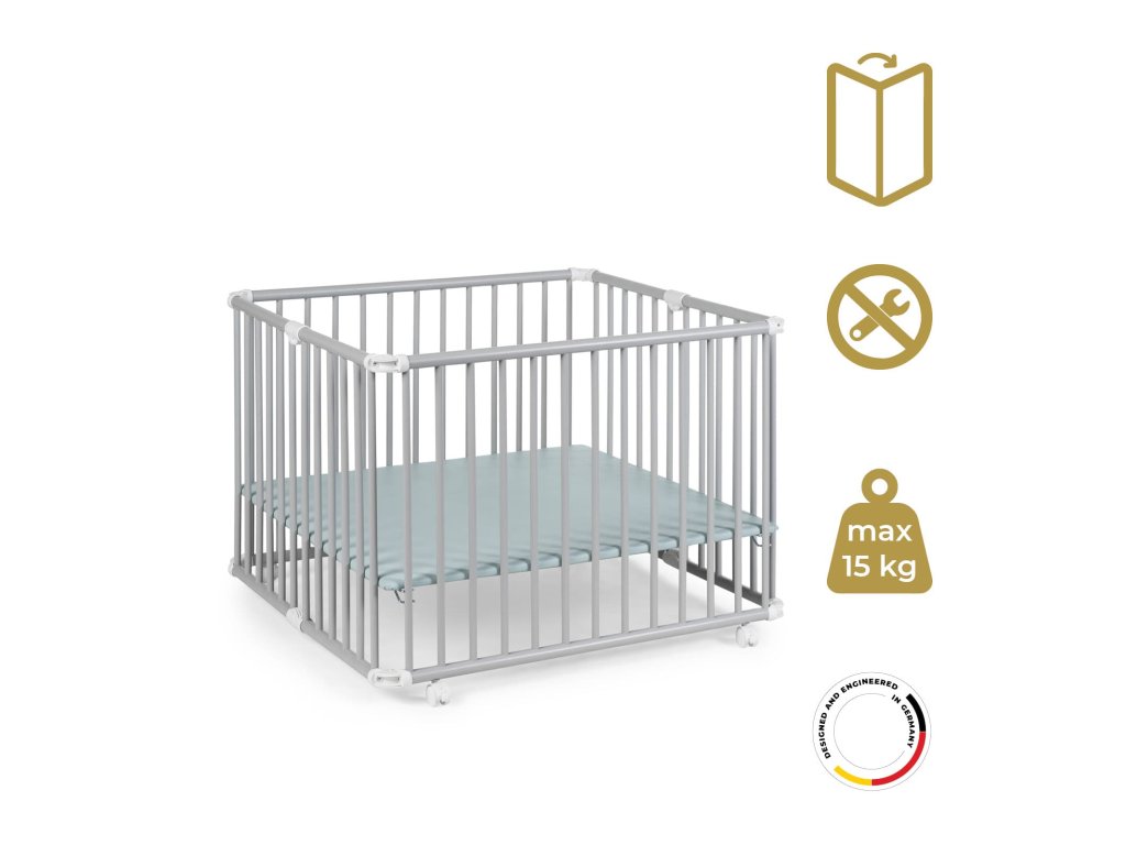 Základnu lze nastavit do 3 různých výšek bez použití nářadí a ohrádka tak roste s vaším dítětem. Je polstrovaná a je možné ji otřít vlhkým hadříkem. Díky 4 uzamykatelným kolečkům je ohrádka mobilní a stabilní.