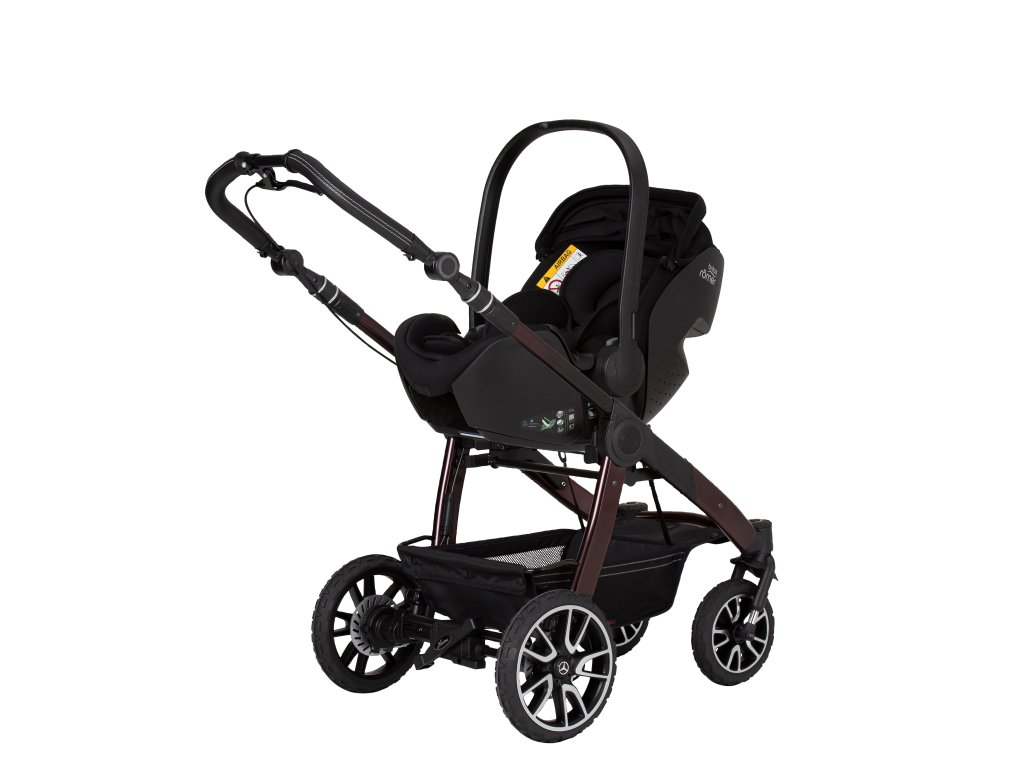 Mimořádné designy završuje elegantně zbarvený podvozek se vzorem Mercedes-Benz a magneticky uzamykatelný pásový systém, který se extrémně snadno ovládá a pohodlně se nastavuje. Navíc jsou zde dvojité vyklápěcí sluneční clony, které zajistí optimální ochranu před sluncem pro vaše děti. Bag2Go je součástí standardního rozsahu dodávky pro všechny modely. Tuto tašku, ideální na mobilní telefony, klíče, peněženky nebo láhve, lze snadno připevnit k rukojeti.