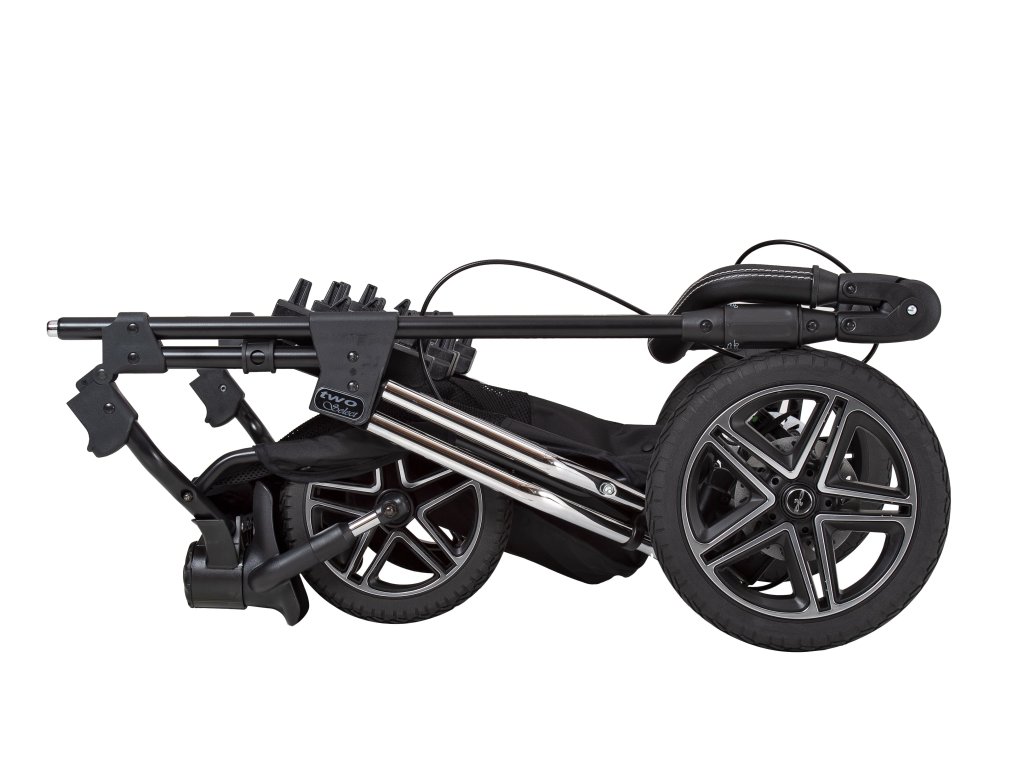 Two Select je standardně vybaven ruční brzdou a vysoce výkonnými brzdovými kotouči - pro pohodovou jízdu i v těžkém terénu. Výšku rukojeti lze individuálně přizpůsobit velikosti vašeho těla. Podvozek projde všemi dveřmi (standardní velikost dveří 80 cm). Hluboké nebo sportovní korby lze pomocí klik systému během chvilky jednotlivě vyjmout.