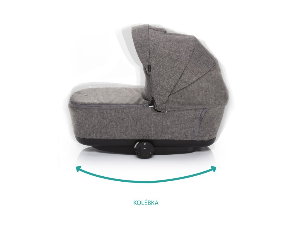 Po vybratí z podvozku môžete hlbokú kolísku použiť ako kolísku, napríklad na návšteve. Alebo môžete použiť zámok na spodnej strane, aby ste kolísku pevne udržali na mieste. Slnečná clona je dôležitou súčasťou striešky. Prenosná postieľka je tiež vybavená rukoväťou na prenášanie, ktorá je elegantne skrytá v strieške kočíka. Rukoväť tak nenarušuje vzhľad kočíka.