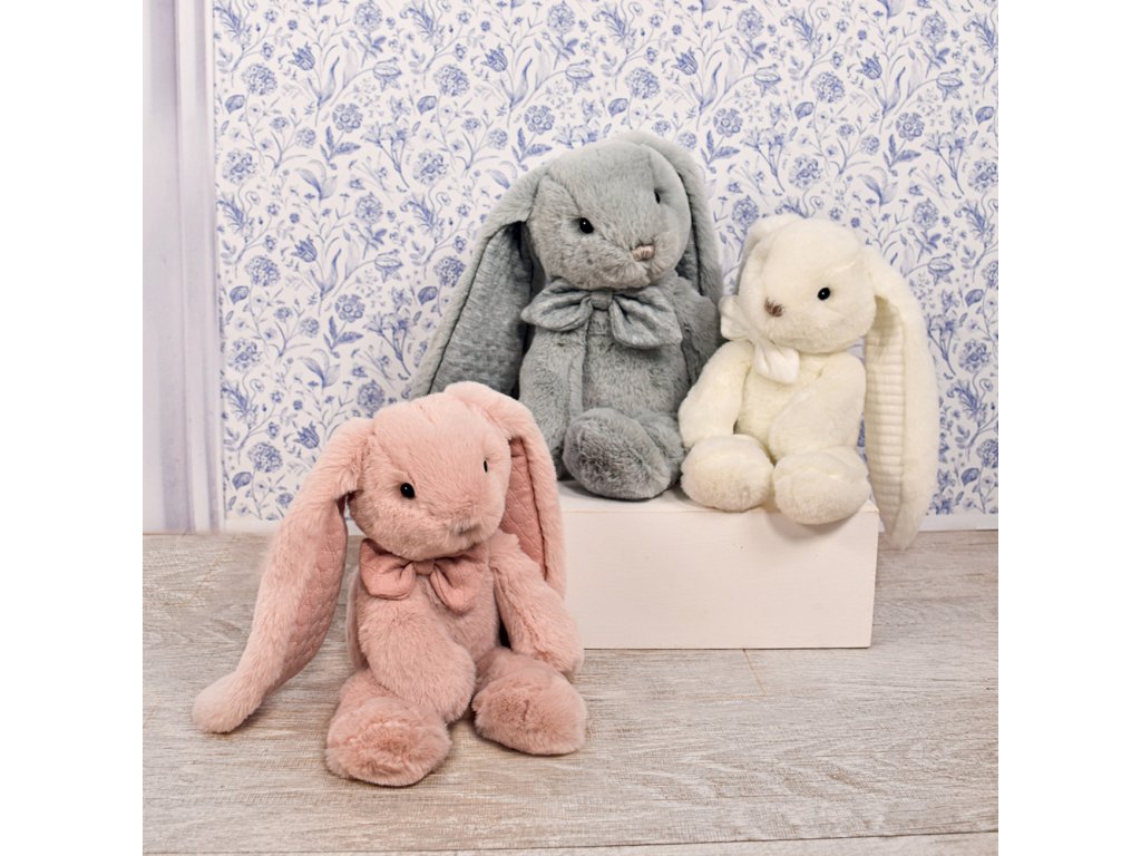 Krásny a mäkkučký zajačik, veľmi elegantný s malým motýlikom.