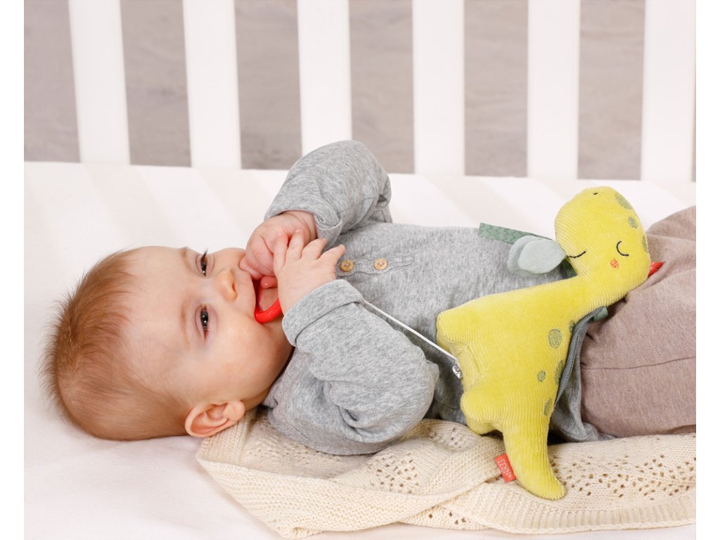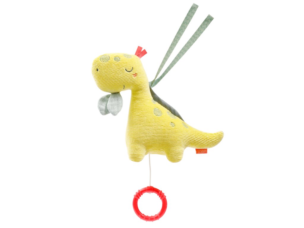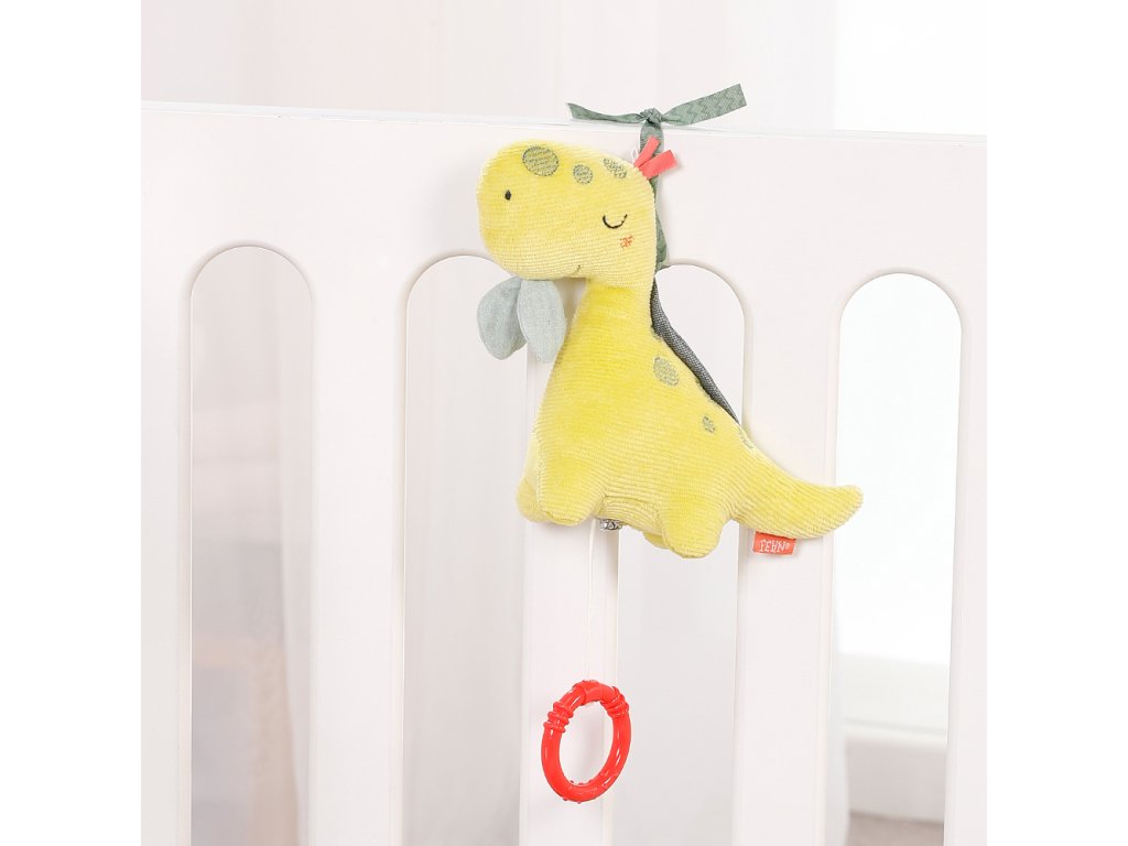 Malý plyšový kamarát, ktorého si deti hneď zamilujú. Mäkký kvalitný plyš je doplnený o naťahovací hudobný mechanizmus . Po natiahnutí dinosaurus hrá uspávanku, ktorá trvá 2 minúty a má regulovanú hlasitosť . Roztomilý plyšák taktiež podnecuje detskú fantáziu a rozvíja jemnú motoriku. Pomocou látkovej mašličky ho možno ľahko pripevniť na postieľku, kočík alebo detskú autosedačku .