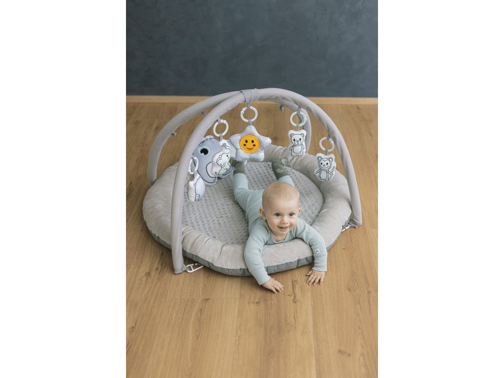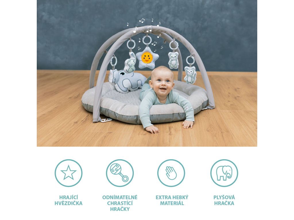 Hebučká hracia deka Comfort je ideálnou prvou hračkou pre vaše dieťatko. Interaktívne plyšové hračky so štrchátkom zábavnou formou motivujú bábätko k tréningu koordinácie oko - ruka a neskôr k úchopu. Hračky sa dajú jednoducho odopnúť z hrazdičky a je možné ich použiť na autosedačke alebo kočíku.
