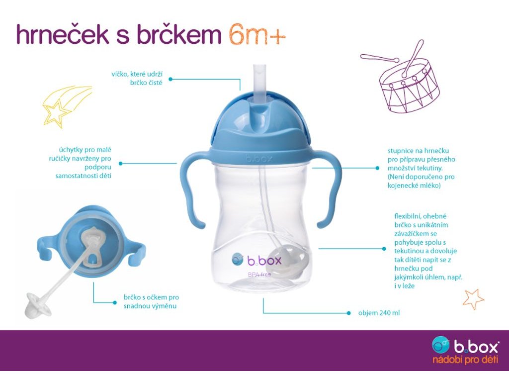 Hrneček s brčkem australské značky b.box je oceňovaný dětmi, rodiči i odbornou veřejností! Víčko je v matné verzi v pestré škále moderních barev a brčko má na spodním konci malé těžítko ve tvaru loga b.box.