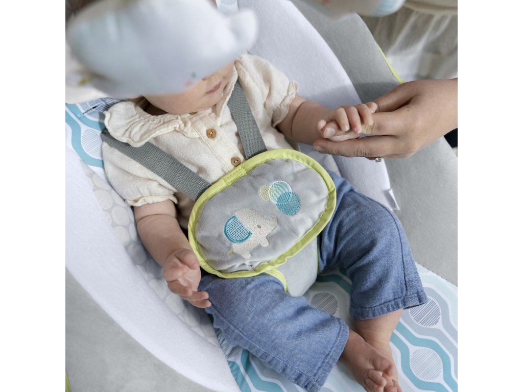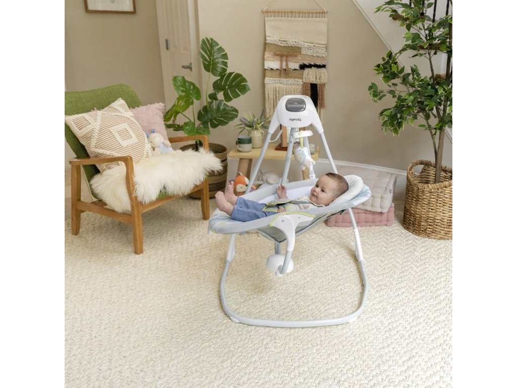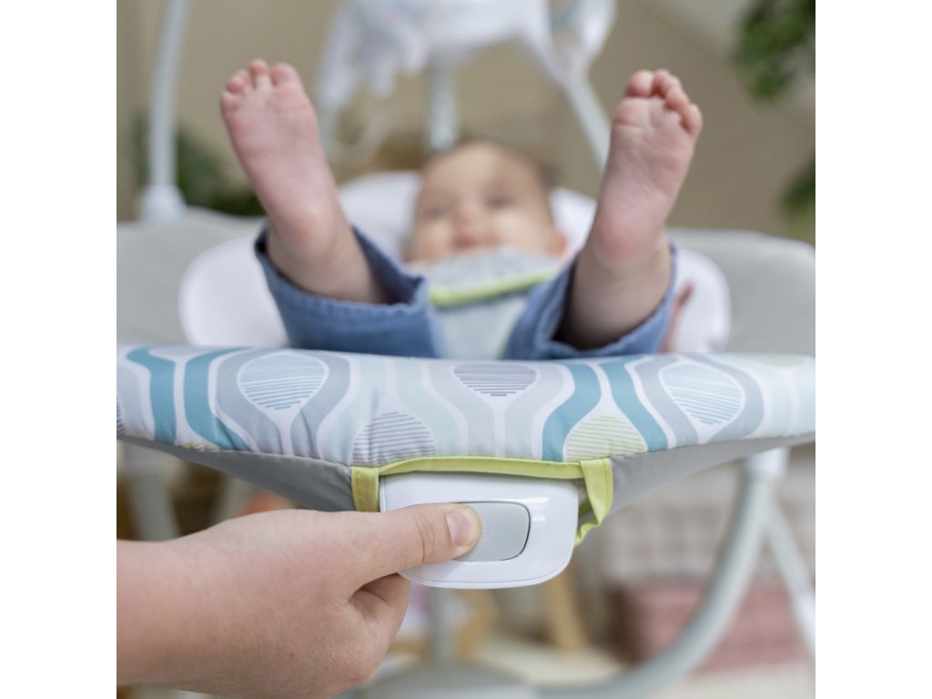 Luxusná veľká hojdačka s množstvom funkcií vám zjednoduší a spríjemní deň, nakoľko bez problémov upokojí a zabaví dieťatko. Táto automatická detská hojdačka zvládne takmer toľko úloh ako vy. Hojdačka obsahuje kolotoč s 2 plyšovými hračkami a bábätká sa radi natiahnu za plyšovým sloníkom a levíkom. Vďaka 2 polohám naklonenia, jemným detailom a mäkkým tkaninám sa bábätko môže hojdať v príjemnom pohodlí. Sedadlo je možné otáčať o 180 stupňov, aby ste mali lepší výhľad na svoje dieťatko a dieťa sa môže hojdať v 3 rôznych smeroch. Ľahký rám má kolieska a ľahko ovládateľnú rukoväť, vďaka ktorým je možné túto hojdačku plnej veľkosti jednoducho prenášať z miestnosti do miestnosti. Na ovládacom paneli GentleTouch si môžete vyberať medzi upokojujúcimi vibráciami, 8 melódiami, 3 zvukov prírody a bieleho šumu. Technológia WhisperQuiet umožňuje dieťaťu hojdať sa v tichu. Získajte niekoľko chvíľ bez použitia rúk, počas ktorých bude bábätko relaxovať vo vašej blízkosti. Aj vy môžete pokojne odpočívať s vedomím, že vibrácie sa vypnú o 30 minút a hojdačka má časovač na 30, 45 alebo 60 minút a automatické vypnutie po 2 hodinách. Hudba sa vypne po 20 minútach a obsahuje samozrejme aj ovládanie hlasitosti. Technológia TrueSpeed udržiava 6 stálych rýchlostí. Keď sa veci trochu zašpinia, podložka sedadla je odnímateľná a môžete ju oprať v práčke. Roztomilý neutrálny dizajn sa hodí do každej domácnosti a je vhodný pre dievčatko aj chlapca. Priložený USB kábel poháňa pohyb hojdačky a hudbu, zatiaľ čo 1 C batéria poháňa vibračnú jednotku (sieťový adaptér a batérie nie sú súčasťou balenia). Batéria pre vibračnú jednotku sa nachádza v základni hojdačky v samostatnom priestore a kryt sa dá ľahko odstrániť 1 skrutkou.