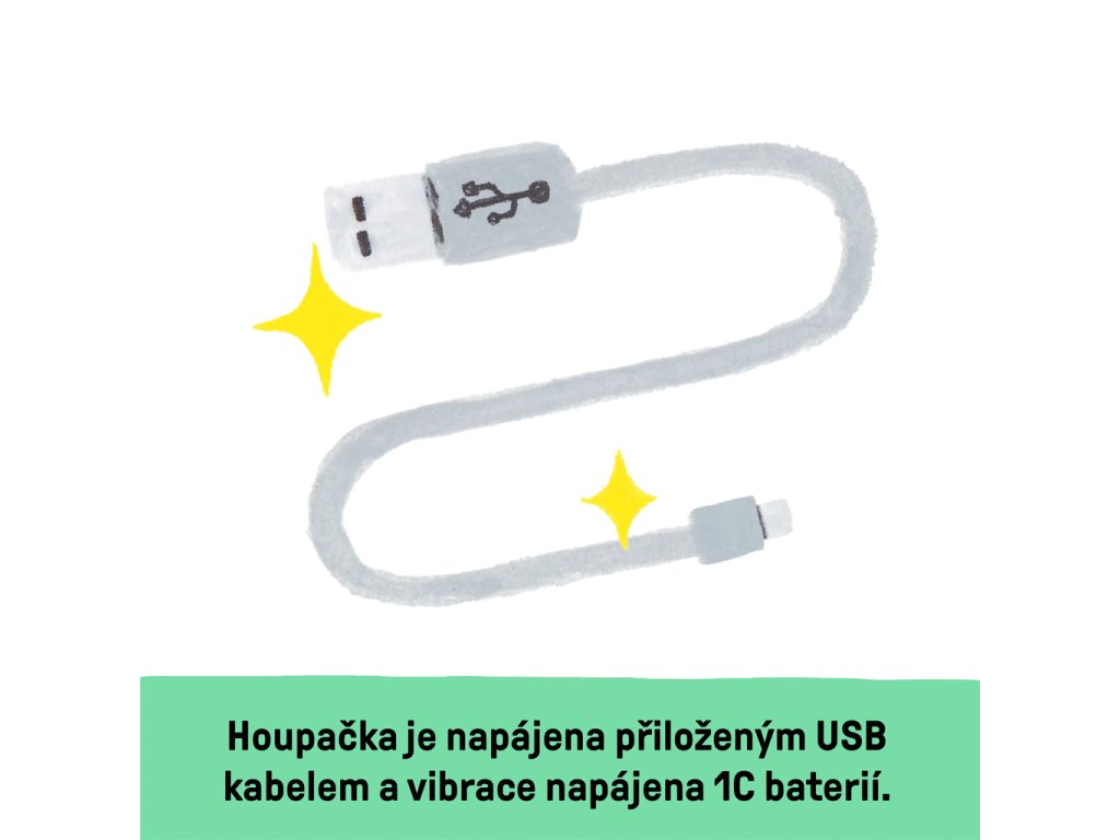 Dodávaný USB kábel napája hojdací pohyb a hudbu. 1 C batéria napája vibračnú jednotku (sieťový adaptér a batérie nie sú súčasťou balenia). Batéria vibračnej jednotky sa nachádza v spodnej časti hojdačky v samostatnom priestore a kryt sa dá ľahko odstrániť.
