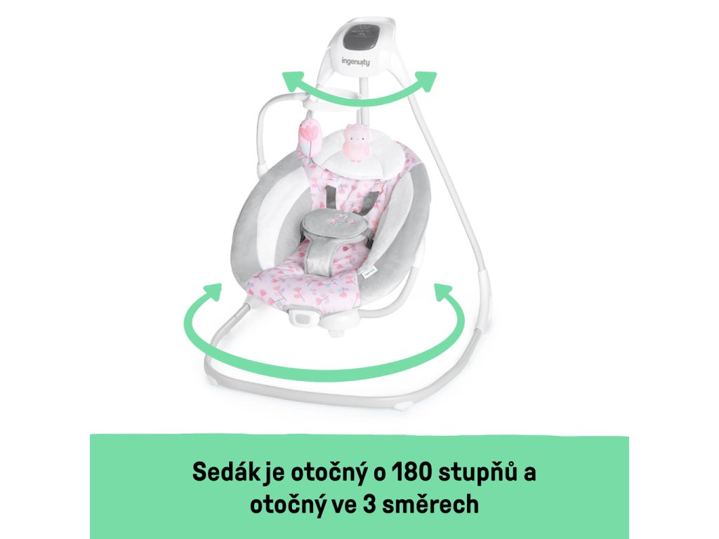- Táto hojdačka má 3 smery hojdania a sedadlo, ktoré sa otáča o 180 stupňov.