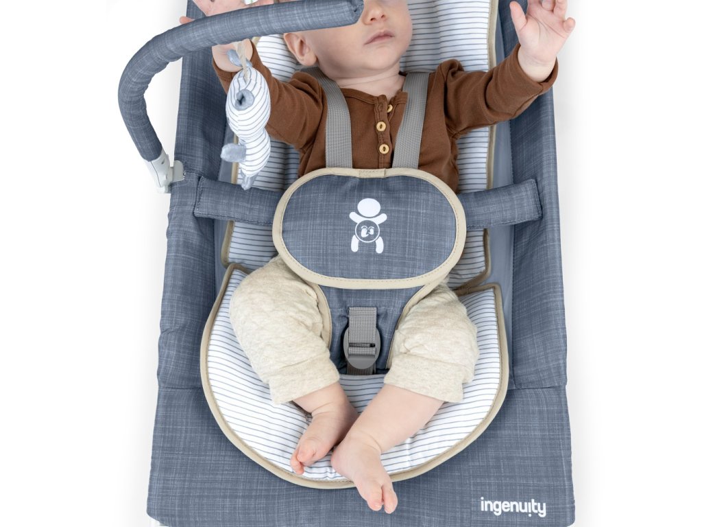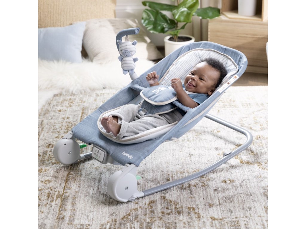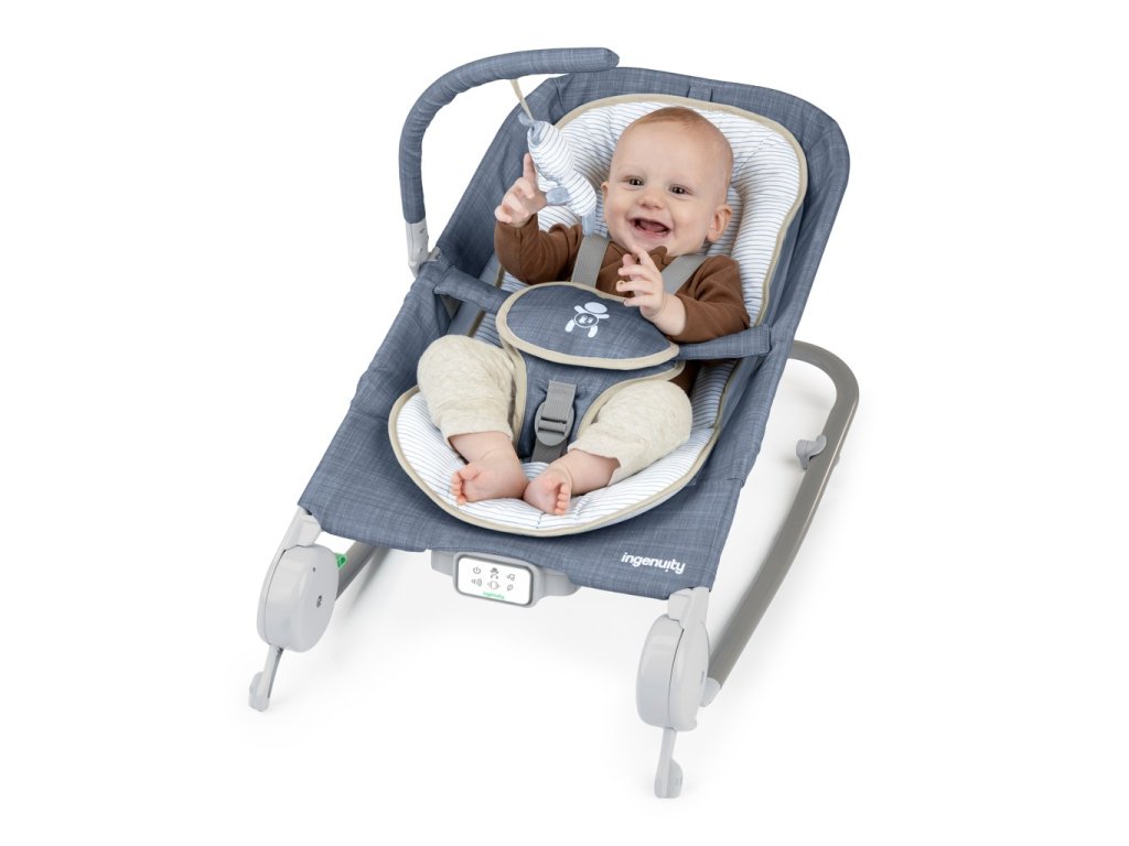 INGENUITY Lehátko masážne vibrujúce s melódiou Happy Belly™ Rock-to-Bounce – Chambray 0m+ do 9kg