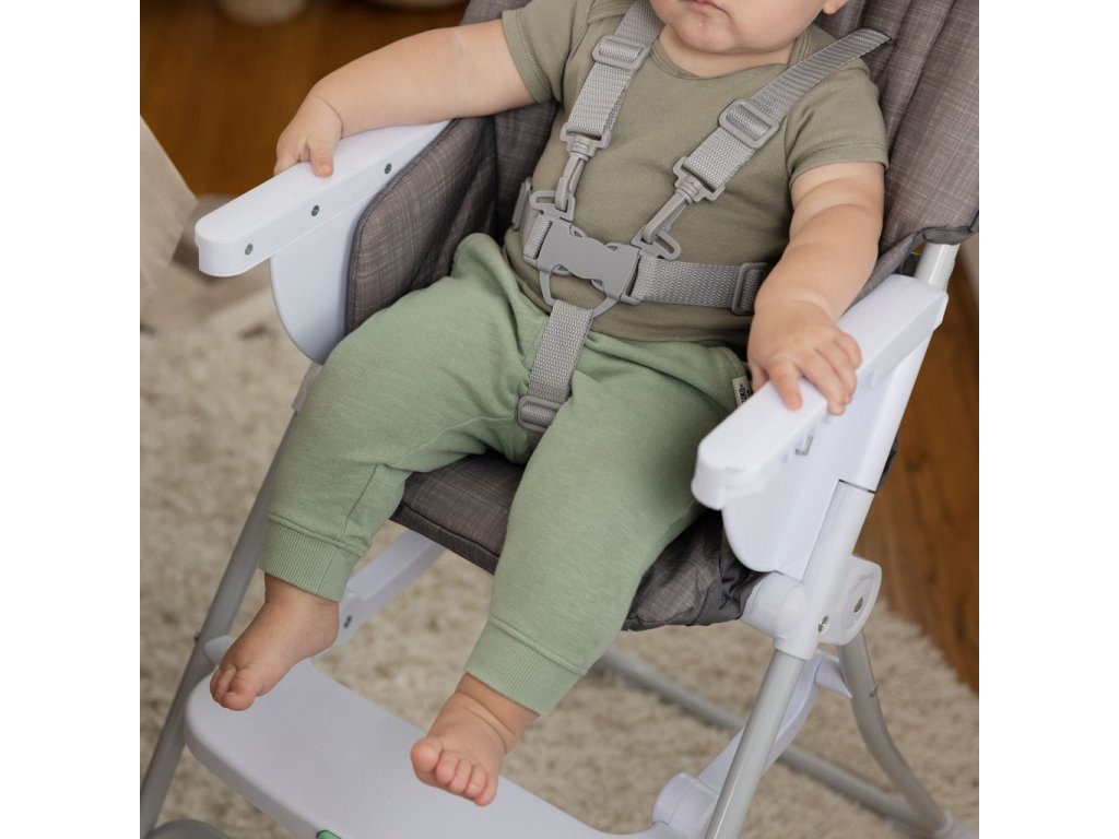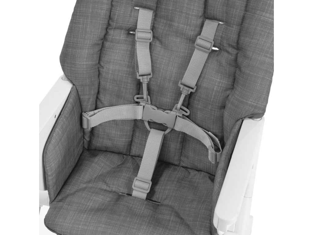Je to jediná vysoká stolička, ktorá ponúka tanier na podporu schopností dieťatka pri samokŕmení. Jedinečný 3-dielny tanier Twist & Dine sa bezpečne uzamkne na svojom mieste, aby ho malé deti nehodili na zem, a je vhodný do mikrovlnnej rúry pre jednoduchú prípravu jedla. Ako dieťa rastie, veľký pultík sa nastavuje do 3 polôh. Pultík sa pri skladovaní pripevňuje k operadlu stoličky. Sedacia podložka je umývateľná v práčke. 5-bodové bezpečnostné pásy zaisťujú bezpečnosť dieťaťa.