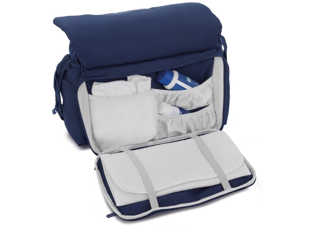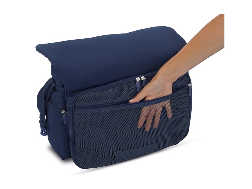 - Vo vnútri prednej časti je ďalšie na zips uzatvárateľné vrecko vybavené oddeleniami pre hygienické a praktické uloženie potrieb a prebaľovacie podložky.