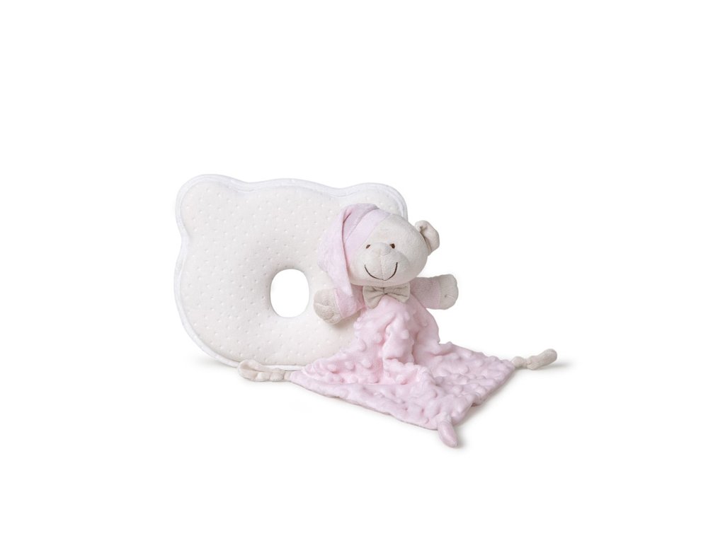 Tato dárčeková sada antiplagiocefalického vankúsika v tvare medvedíka a prítulky je ideálny darček pre bábätká už od narodenia.