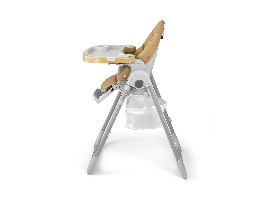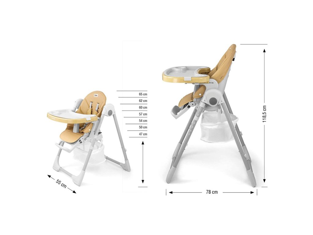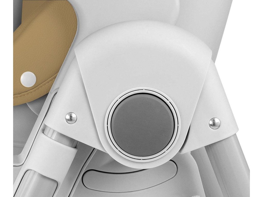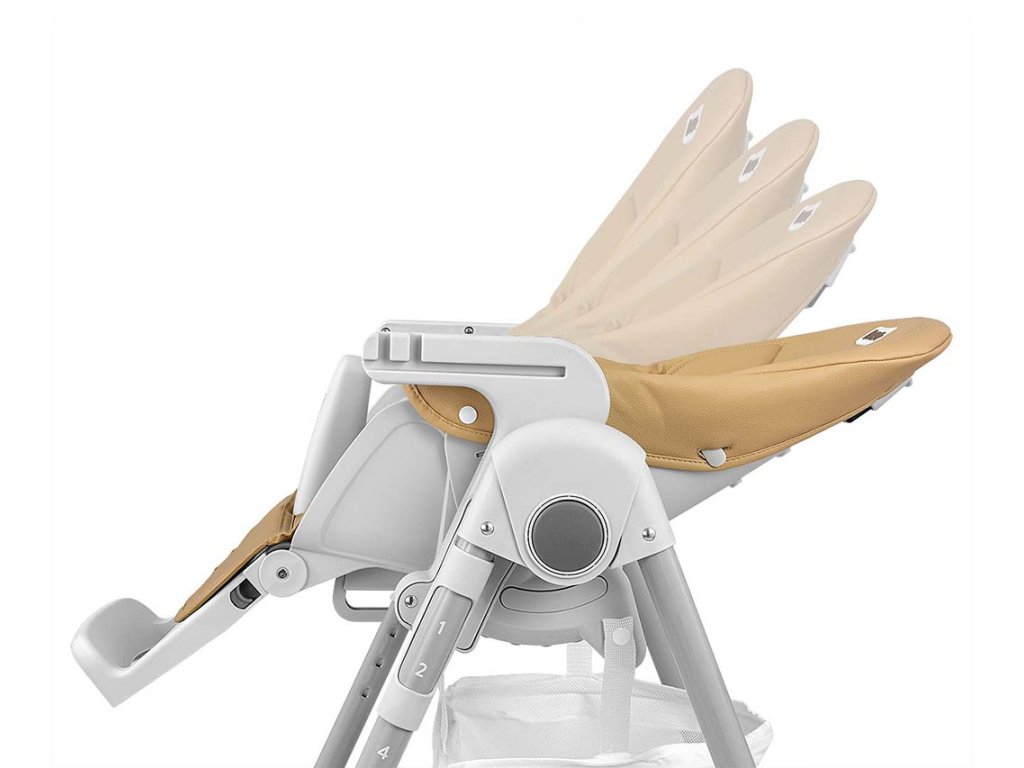 Čalúnenie stoličky je vyrobené z ekologickej kože a má navyše mäkkú vložku pre najmenších. Pre bezpečnosť dieťaťa je vybavená 5-timi bodovými nastaviteľnými pásmi a prídavnou zábranou proti pošmyknutiu. Na zadnej strane operadla je úchyt na zavesenie tácky. Operadlo aj podnožku je možné sklopiť do ľahu. Sedák je možné zdvihnúť alebo znížiť v 7 stupňoch a nohy majú zabudované gumové kolieska. Celú konštrukciu je možné ľahko a hladko zložiť.
