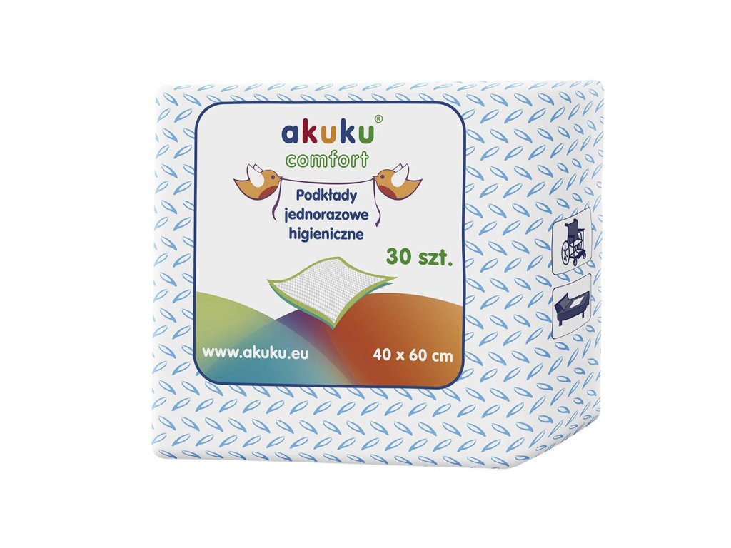 Jednorazové hygienické podložky Akuku. Rozmer: 40x60 cm. Balenie obsahuje 30 kusov.