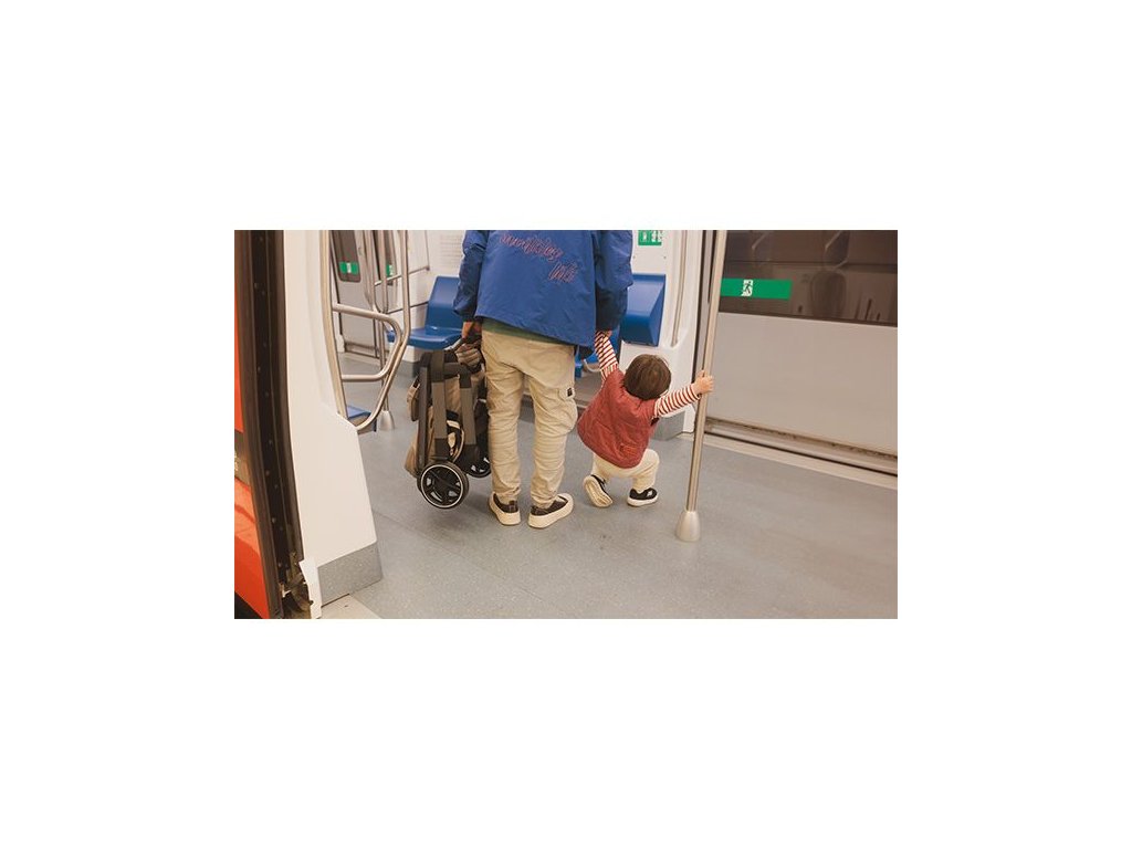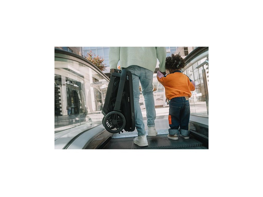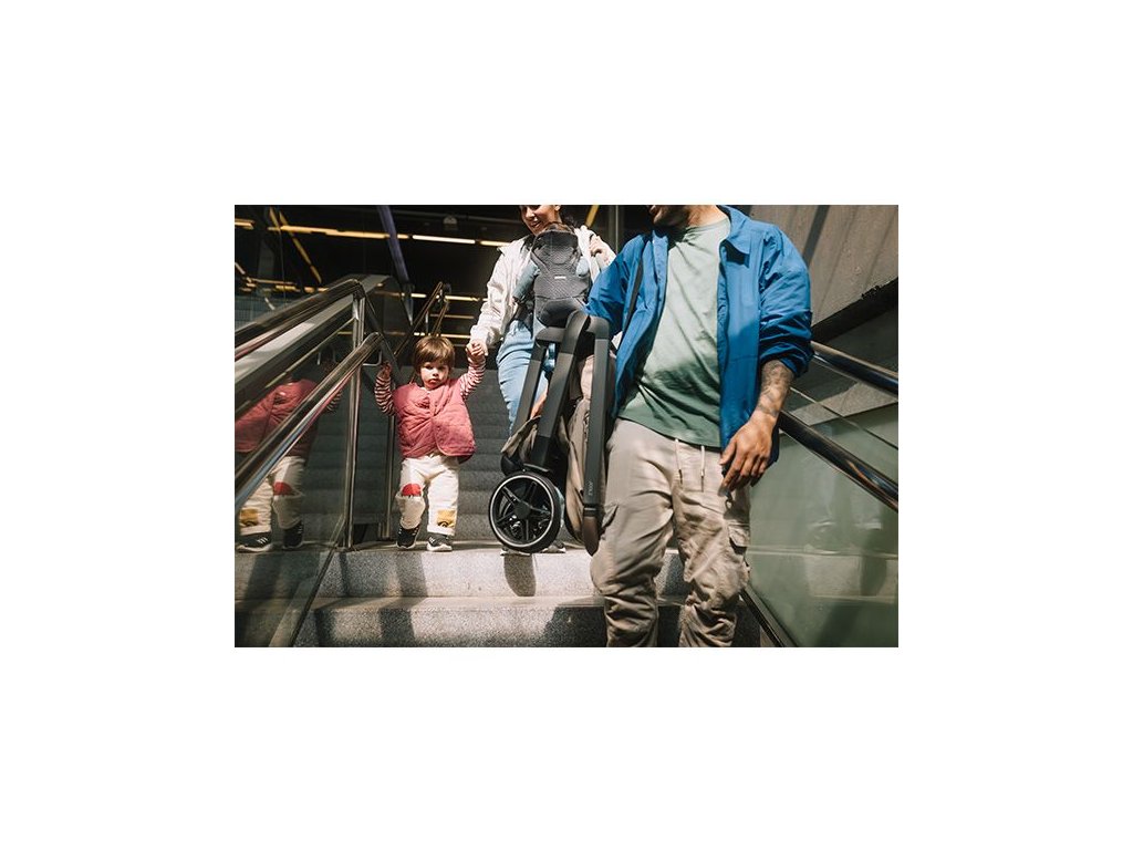 Pri skladaní si môžete vybrať, či potrebujete, aby sedátko smerovalo smerom k vám, alebo von smerom do sveta. Prenosnosť a ľahkosť kočíka je kľúčová, a preto je tu praktický popruh na prenášanie. Môžete si ho prehodiť cez rameno a vyjsť po schodoch s oboma rukami voľnými. Vieme, že hmotnosť s obyčajnými 9 kg oceníte s úsmevom na vašej tvári. Sme jedni z najľahších v segmente kompaktných kočíkov!