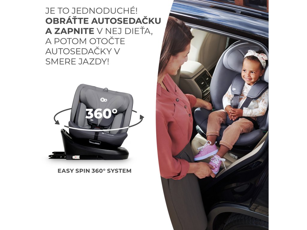 Tento systém výrazne uľahčuje pripútanie dieťaťa do autosedačky. Jednoducho stlačte ľahko dostupné tlačidlo a otočte autosedačku smerom dopredu, aby ste do nej vložili svoje dieťa. Systém EASY SPIN 360° tiež umožňuje rýchlo zmeniť polohovanie (RWF a FWF) bez toho, aby ste museli demontovať celú autosedačku.