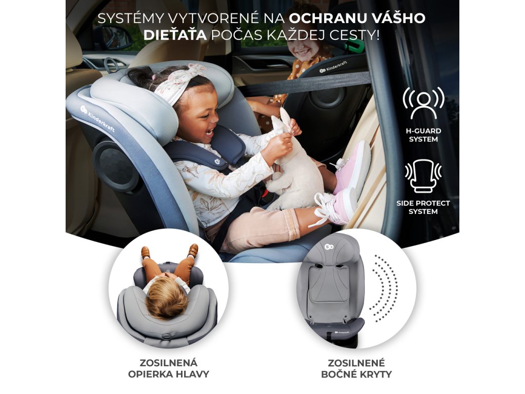 Autosedačka I-GROW má dva špeciálne bezpečnostné systémy určené na ochranu vášho dieťaťa počas cesty. Vystužená opierka hlavy s pamäťovou penou, ktorá absorbuje silu nárazu (H-GUARD SYSTEM). Na druhej strane škrupina autosedačky bola vystužená širokými a vysokými bočnými chráničmi, ktoré pohltia silu nárazu pri bočnom náraze (SIDE PROTECT SYSTEM +).