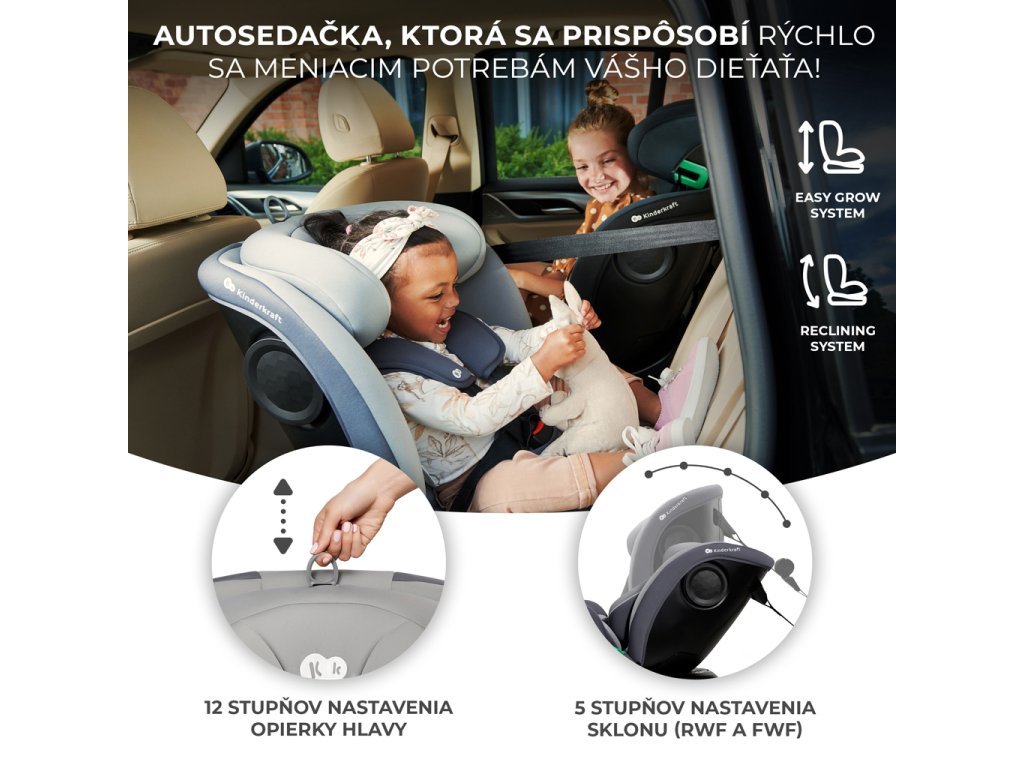 I-GROW rastie spolu s vaším dieťaťom - má až 12-polohové nastavenie opierky hlavy a 5-polohové nastavenie uhla operadla autosedačky (v polohách RWF aj FWF). Nezabudnite, že správne nastavená autosedačka podľa výšky vášho dieťaťa zvyšuje bezpečnosť vašej cesty!