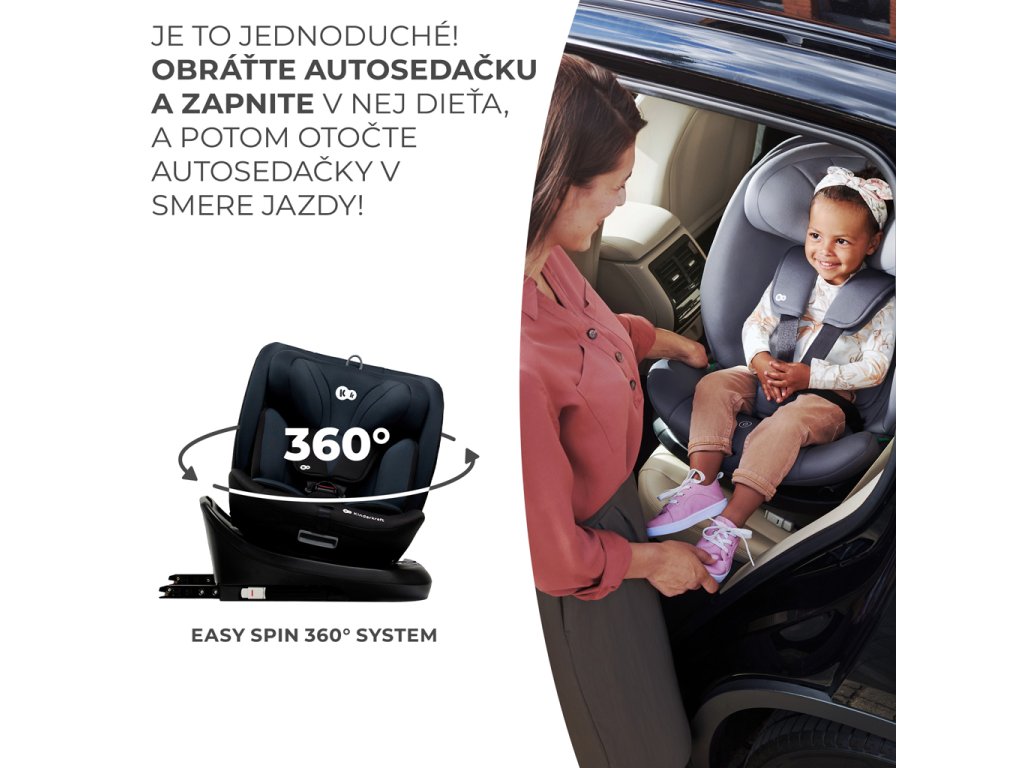 Tento systém výrazne uľahčuje pripútanie dieťaťa do autosedačky. Jednoducho stlačte ľahko dostupné tlačidlo a otočte autosedačku smerom dopredu, aby ste do nej vložili svoje dieťa. Systém EASY SPIN 360° tiež umožňuje rýchlo zmeniť polohovanie (RWF a FWF) bez toho, aby ste museli demontovať celú autosedačku.