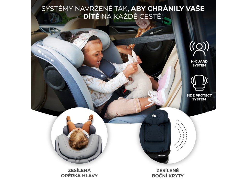 Autosedačka I-GROW má dva špeciálne bezpečnostné systémy určené na ochranu vášho dieťaťa počas cesty. Vystužená opierka hlavy s pamäťovou penou, ktorá absorbuje silu nárazu (H-GUARD SYSTEM). Na druhej strane škrupina autosedačky bola vystužená širokými a vysokými bočnými chráničmi, ktoré pohltia silu nárazu pri bočnom náraze (SIDE PROTECT SYSTEM +).