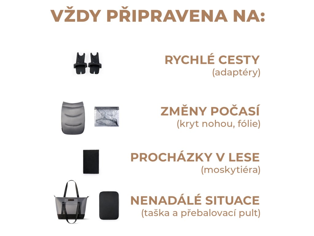 Príslušenstvo: taška s prebaľovacou podložkou, pláštenka, nánožník, moskytiéra, matrac do vaničky, univerzálne adaptéry