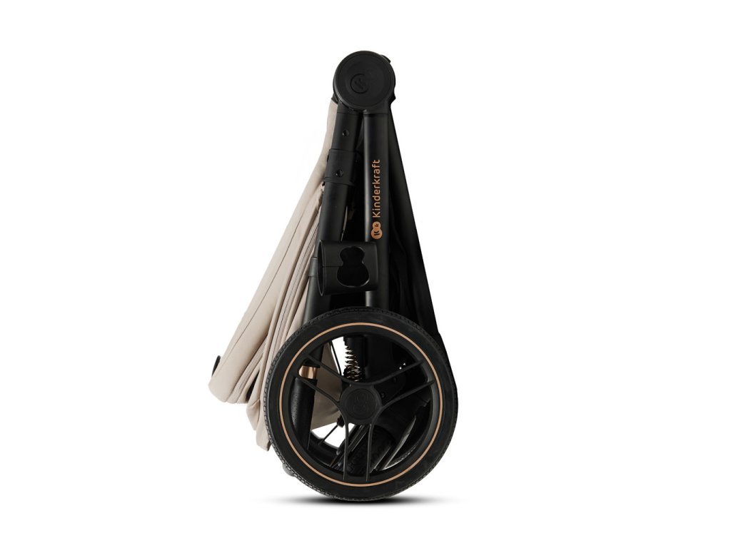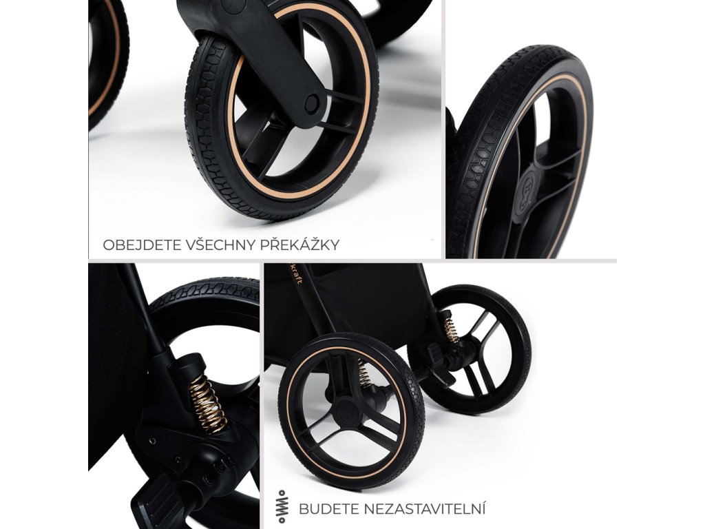 - Veľké kolesá s tlmičmi nárazov umožňujú jednoduché zdvihnutie kočíka a nevyžadujú pumpovanie.