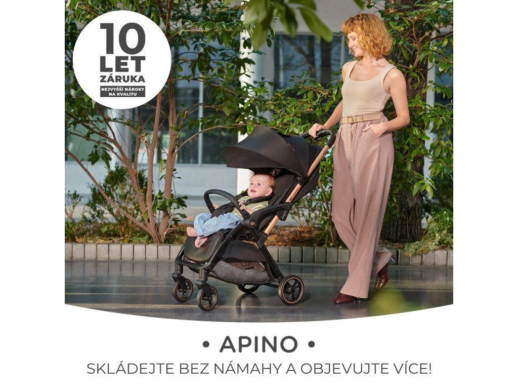 APINO je ľahký, úzky a mimoriadne ľahko ovládateľný športový kočík. Je ideálny ako kočík na každý deň a aj na výlety. Kočík je ľahko ovládateľný a jeho neprepichnuteľné kolesá vás ochránia pred nepríjemnými prekvapeniami na ceste. Nezľakne sa mestskej dopravy, malých výťahov ani schodov. Kočík zložíte do kompaktných rozmerov a vezmete do ruky (váži necelých 7,5 kg) alebo ho pribalíte k batožine do auta.