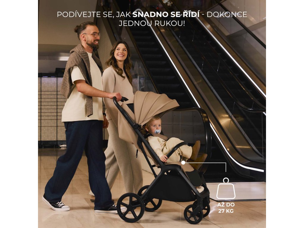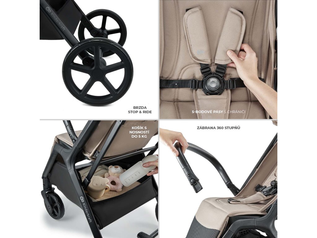 Kočík ponúka nastaviteľné operadlo, dve úrovne nastavenia opierky na nohy a otočné bezpečnostné madlo s možnosťou odpojenia, čo uľahčuje vkladanie a vyberanie dieťaťa z kočíka. Priestranný košík s kapacitou 5 kg pod kočíkom umožňuje pohodlné uloženie nákupov a ďalších potrebných vecí.