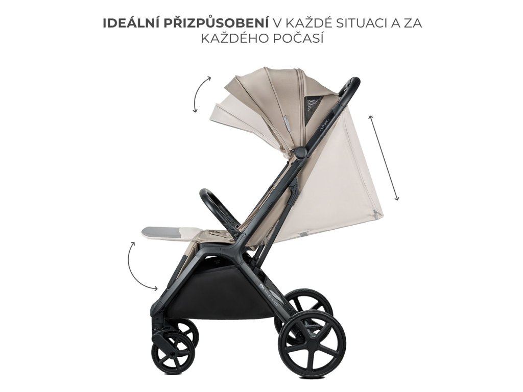 Kočík LOOM vyniká svojou ovládateľnosťou – dá sa jednoducho riadiť jednou rukou a kolesá odolné proti prepichnutiu zvládnu rôzne terény bez námahy. Strieška chráni pred slnkom a vetrom, zatiaľ čo ventilačné panely zabezpečujú správny prietok vzduchu, čím zaručujú pohodlie počas celého roka.
