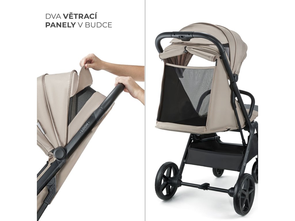 Kočík LOOM má ventilačný panel na zadnej strane, ktorý sa dá otvoriť, keď je operadlo nastavené do ľahu. Okrem toho vhodnú ventiláciu zabezpečuje aj okienko umiestnené na strieške.