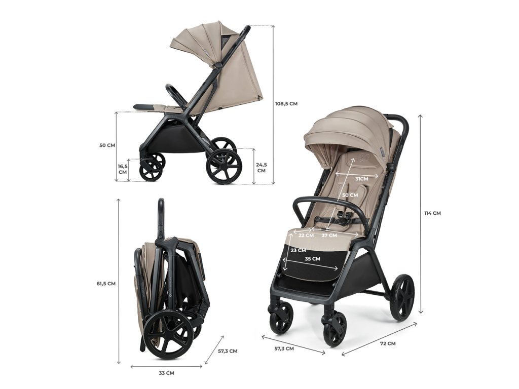 Ľahká konštrukcia a automatické skladanie uľahčujú uskladnenie a prepravu. Kompaktné rozmery po zložení umožňujú pohodlne uložiť kočík do kufra auta alebo skrine.