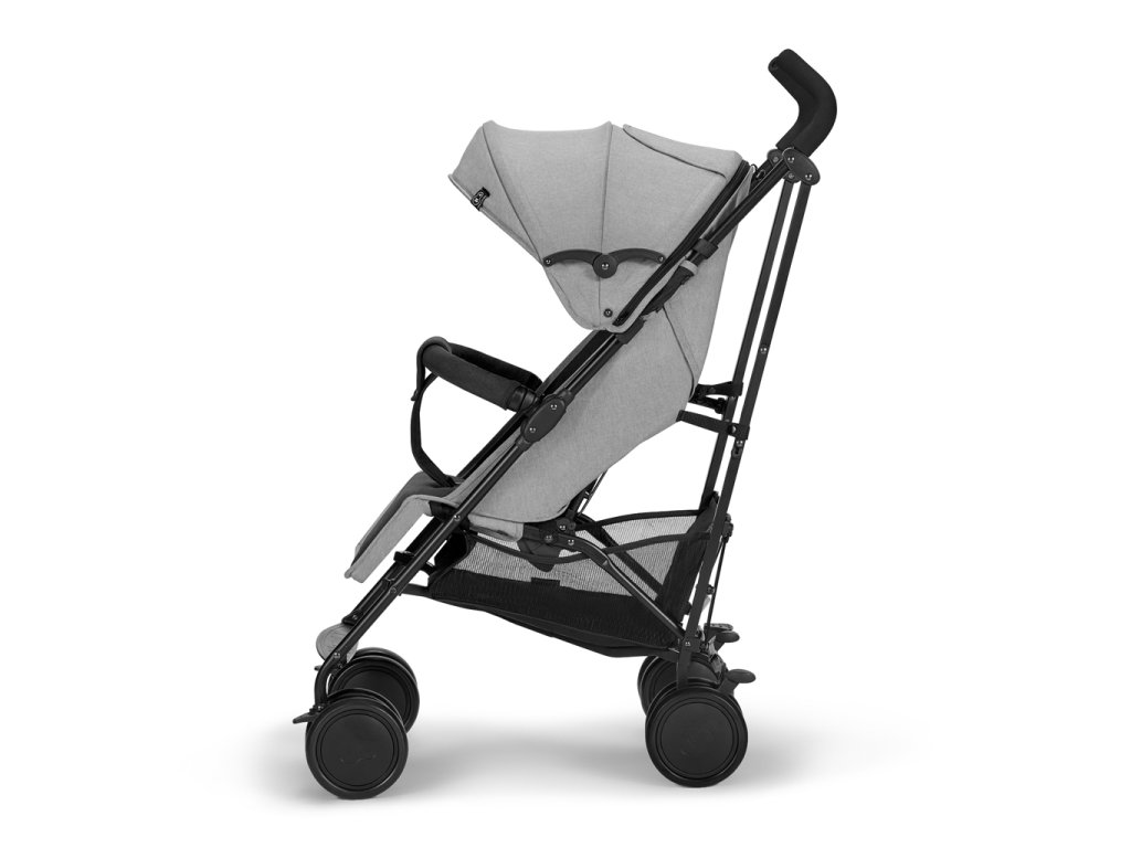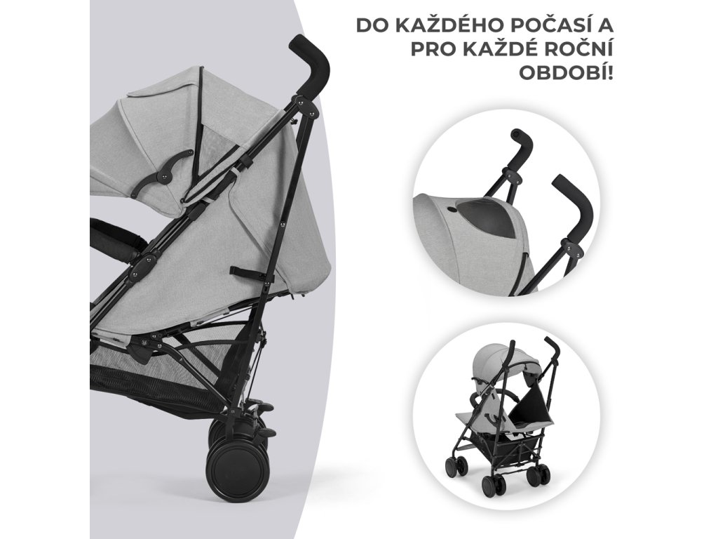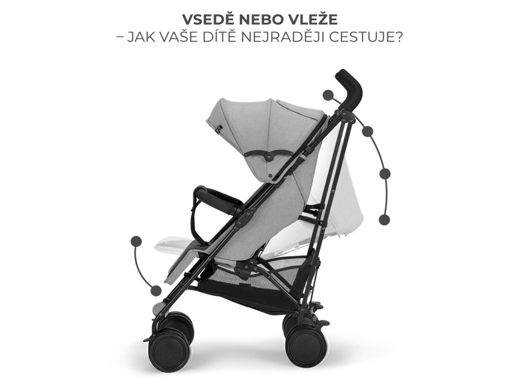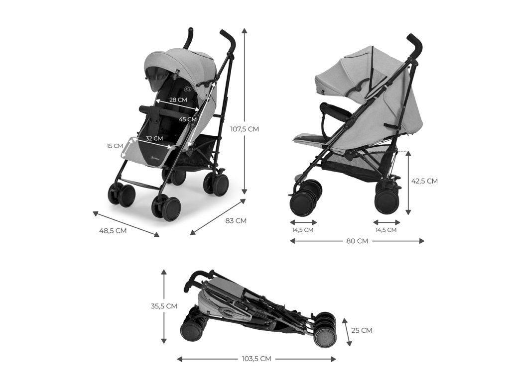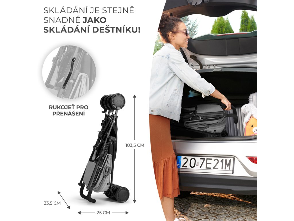 - Jednoducho sa prepravuje – kočík sa dá zložiť do kompaktných rozmerov za niekoľko chvíľ (103,5 cm x 35,5 cm x 25 cm). Zmestí sa do batožinového priestoru auta, a vďaka blokáde proti rozloženiu sa nemusíte obávať, že sa kočík sám rozloží počas cesty.