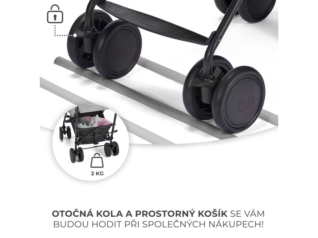 - Dobre manipulovateľné kolesá – sú vyrobené z neprepichnuteľnej peny. Nevyžadujú si hustenie, sú ľahké a uľahčujú vedenie kočíka. Predné kolesá majú blokádu pre rovnú jazdu, čo bude užitočné v ťažšom teréne.