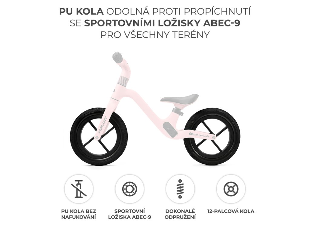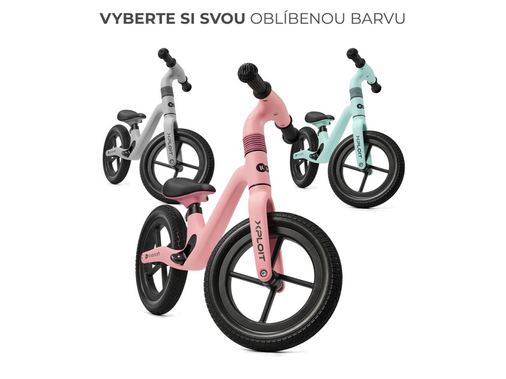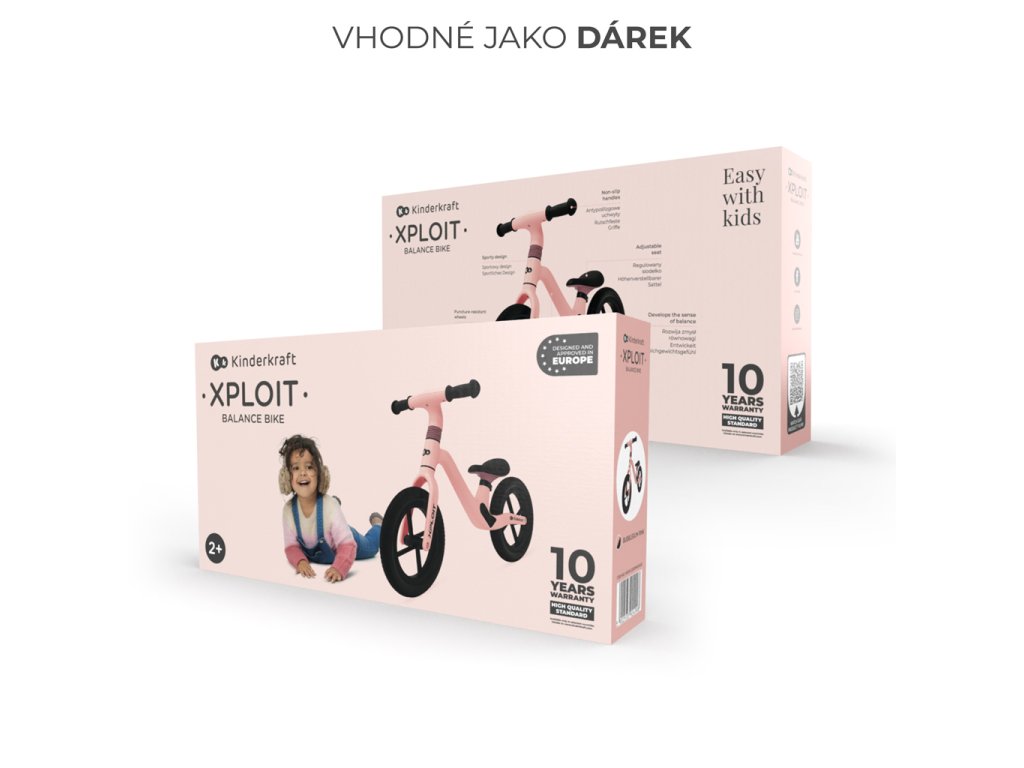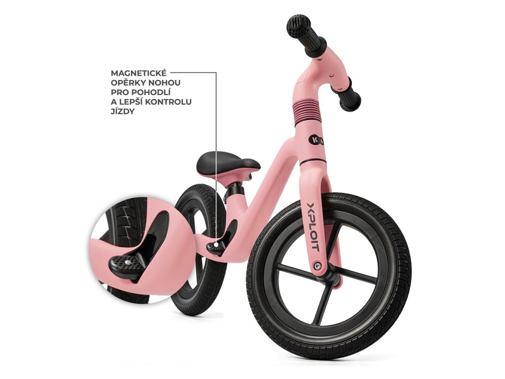 Jeho veľkou výhodou sú veľké PU kolesá, odolné proti prepichnutiu, sú odpružené a majú dobrú priľnavosť k povrchu, vďaka čomu sú vhodné ako na asfaltové, mestské cesty, tak aj na lesné cestičky. Majú športové ložiská 9ABEC, vďaka nim má detský bicykel plynulejší chod, čo uľahčuje učenie sa jazdy. Detské odrážadlo XPLOIT učí a zároveň zabáva: vaše dieťa bude ľahšie získavať schopnosť udržať rovnováhu a stabilitu a tiež ho pripraví na učenie sa bicyklovať s pedálmi.