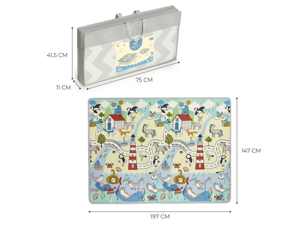 Toto je MATTY 2 – váš spoločný priestor na odpočinok, učenie aj zábavu. Ide o obojstrannú podložku, ktorá má na jednej strane pútavú potlač, umožňujúcu batoľaťu uplatniť svoju predstavivosť - nabáda k hre a rozprávaniu príbehov. Na druhej strane je tlmený geometrický dizajn, ktorý ľahko zapadne do priestoru určeného pre celú rodinu: napr. do obývačky alebo kuchyne.