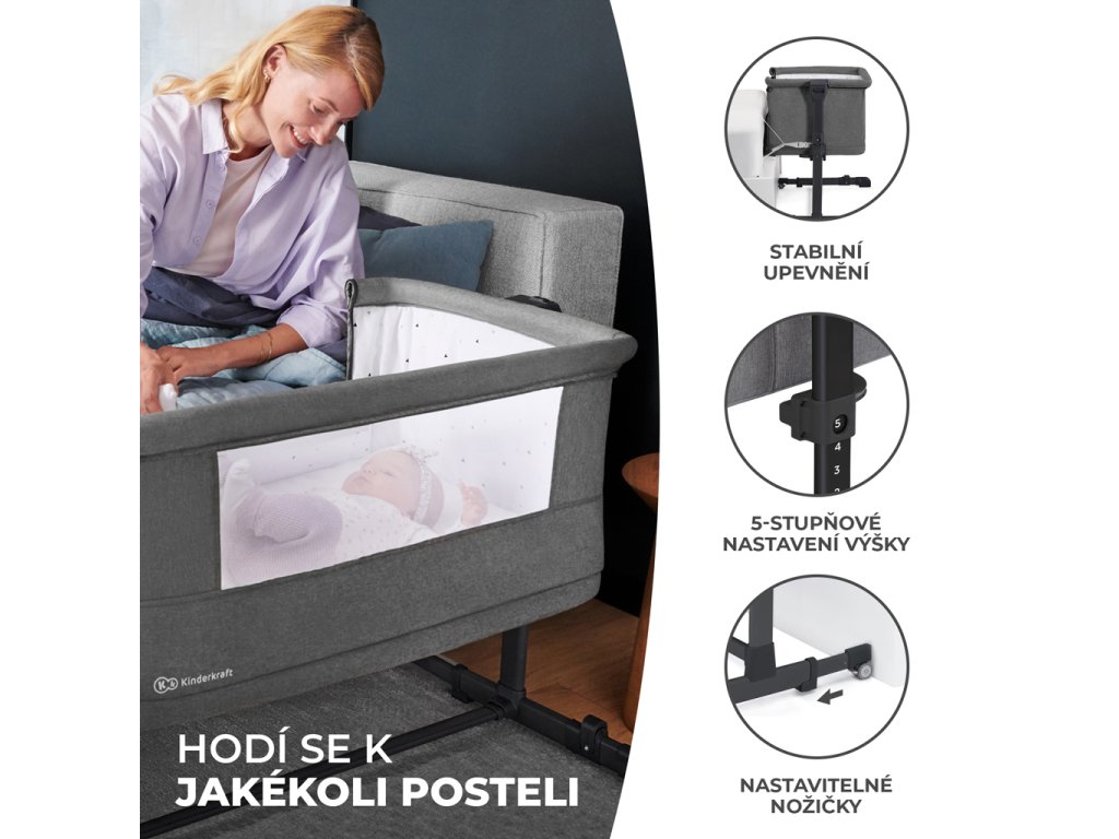 Deti potrebujú teplo a blízkosť rodičov - ich potreba bezpečia silnie najmä v noci. V Kinderkraft vieme, ako to spojiť s potrebou pohodlného spánku. Dodatočná detská postieľka NESTE GROW je niečo viac než klasická prístelka. Je to multifunkčná postieľka, ktorá zároveň plní funkciu postieľky pre dojča, dodatočnej detskej postieľky a samostatnej postieľky pre dvojročné dieťa.