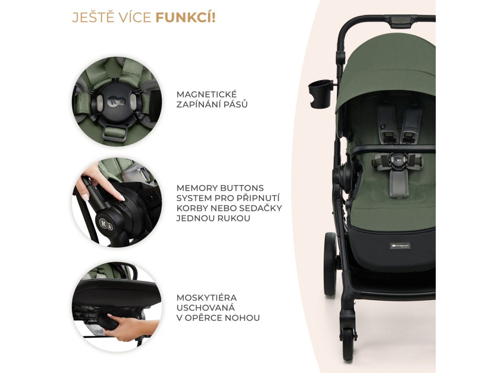 MEMORY BUTTONS SYSTEM umožňuje rýchlo odpojiť športový kočík a vaničku od rámu - len jednou rukou. Magnetická spona pásov uľahčuje zapínanie dieťaťa v kočíku. A pomocou priložených adaptérov môžete vytvoriť TRAVEL SYSTEM, ak máte detskú autosedačku.