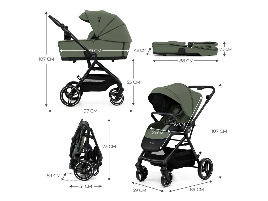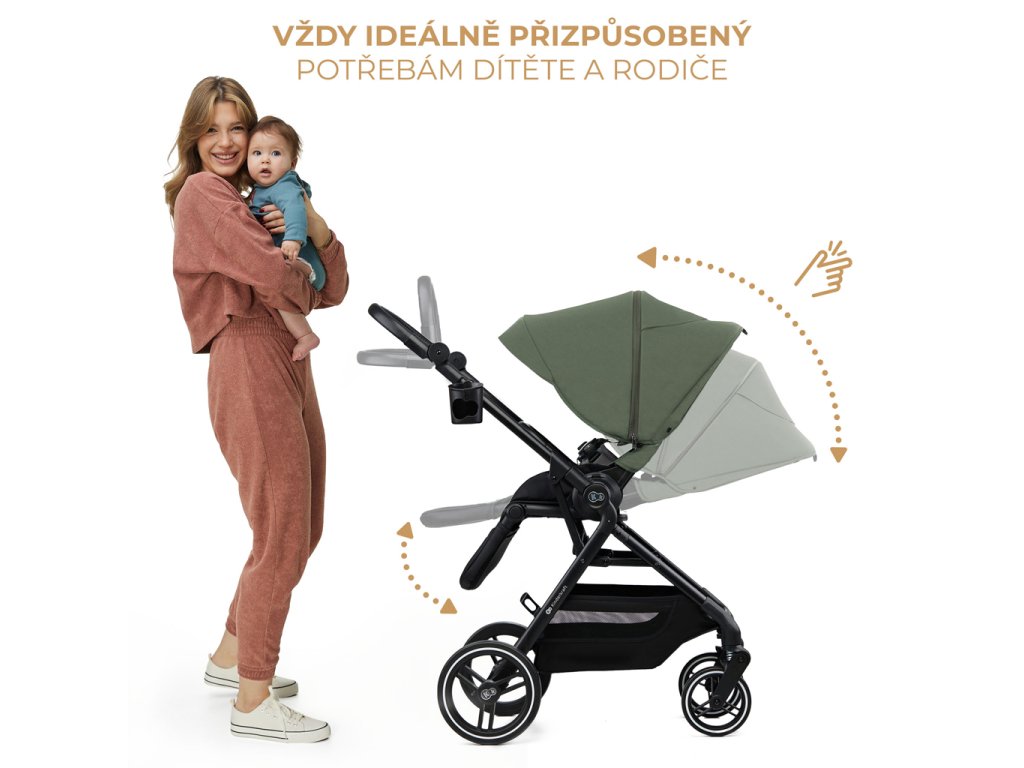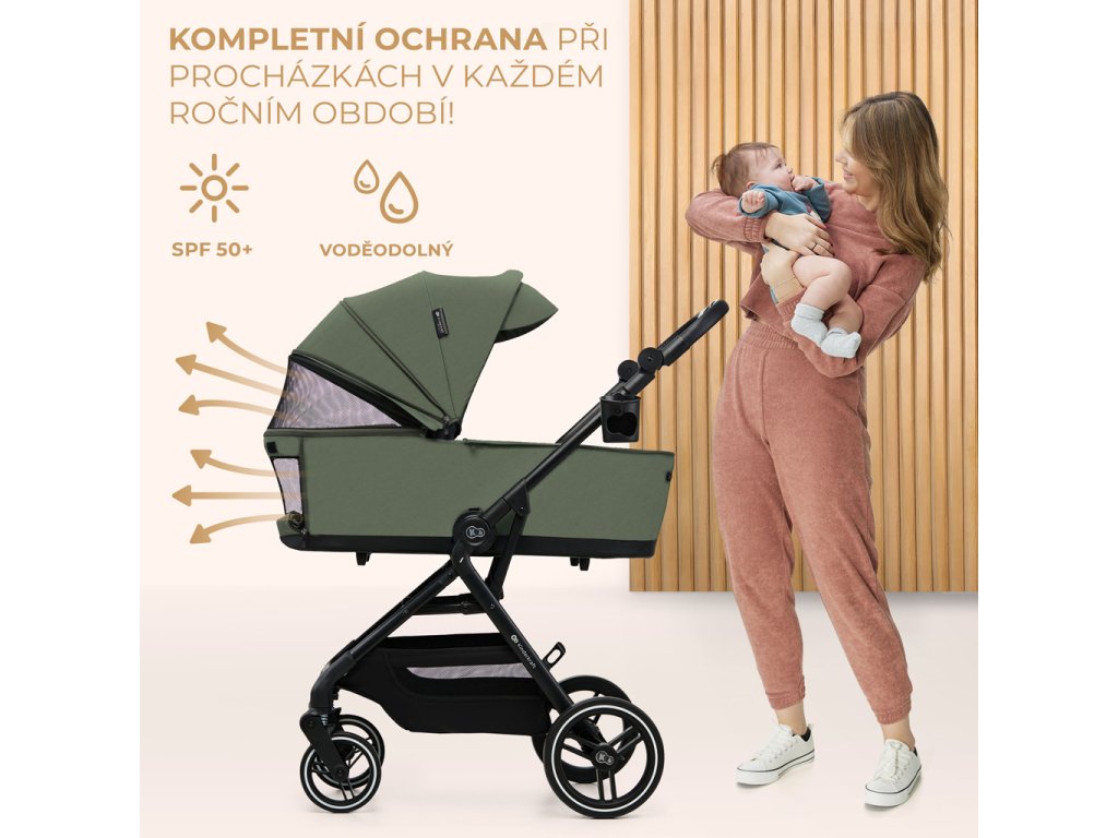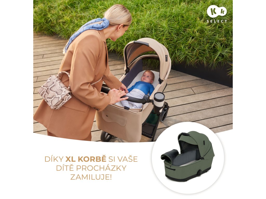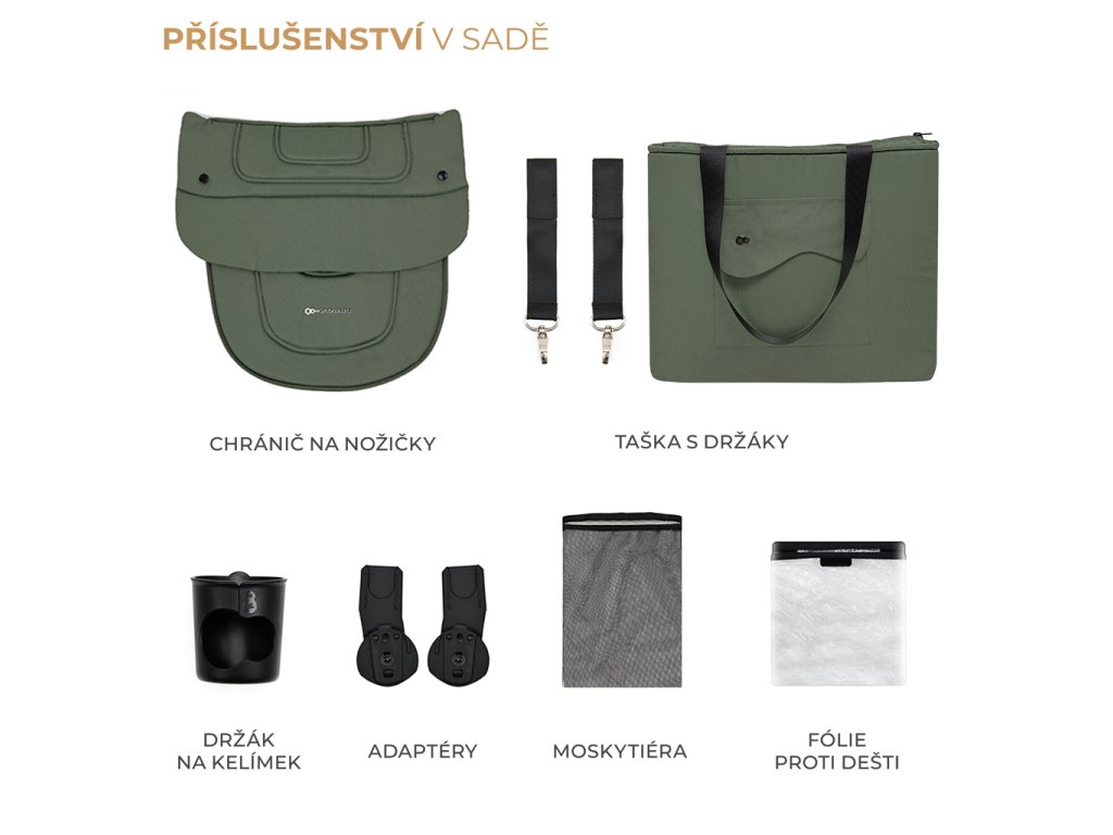 Veľkorysý kôš s nosnosťou až 5 kg pojme všetky potrebné veci. Ďalšia deka a plienky? Alebo nákupy, ktoré ste urobili po ceste domov? Jednoduchý prístup z oboch strán vám umožní rýchlo vytiahnuť každú vec. Kočík sa dodáva aj s príslušenstvom: sieťkou proti hmyzu (v opierke na nohy, ktorú budete mať vždy so sebou), kryt na nožičky, pláštenkou proti dažďu, držiakom na pohár, taškou na rukoväť pre rodiča a adaptérmi na autosedačku.
