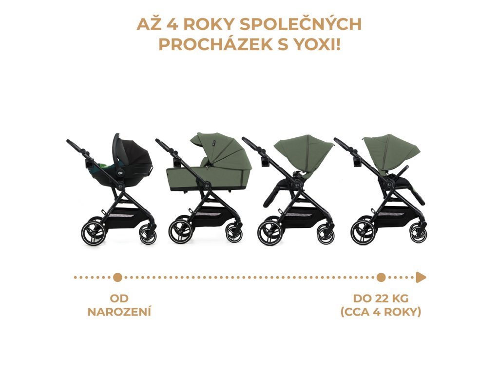 Stačí jediný pohľad, aby ste si YOXI zamilovali. Je to multifunkčný detský kočík 2 v 1, ktorý vás bude sprevádzať na prechádzkach od narodenia vášho dieťaťa až do 4 rokov (22 kg). Je mimoriadne obratný a veľmi ľahko sa s ním manévruje. Na samom začiatku budete svoje dieťa voziť v pohodlnej hlbokej vaničke s mäkkým matracom a veľkou nepremokavou strieškou s filtrom UPF50+, ktorá umožňuje odkrytie látky, takže vaše dieťa má panoramatický výhľad, keď leží na bruchu. Keď vaše dieťatko vyrastie, prenosná vanička sa zloží na plocho a uloží sa do skrine - a namiesto nej vás privíta športové sedadlo, ktoré sa dá pripnúť smerom dopredu alebo dozadu voči smeru jazdy.