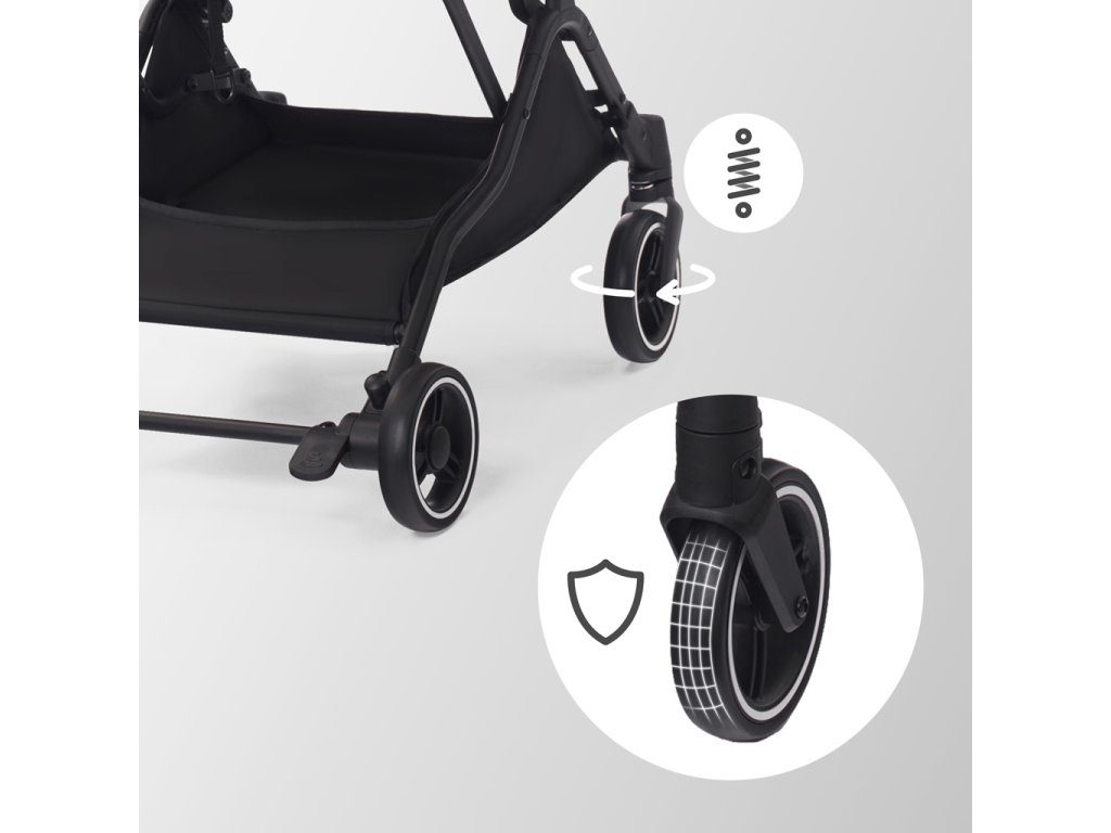 Manévrovateľné, bezúdržbové kolesá s odpružením sú odolné voči prepichnutiu a boli vyrobené z pevnej peny. Odpruženie zaručuje dieťaťu príjemné cestovanie, a vďaka možnosti otočiť predné kolesá o 360° je kočík mimoriadne manévrovateľný a jednoducho sa riadi. Bez akýchkoľvek problémov obídete každú prekážku.