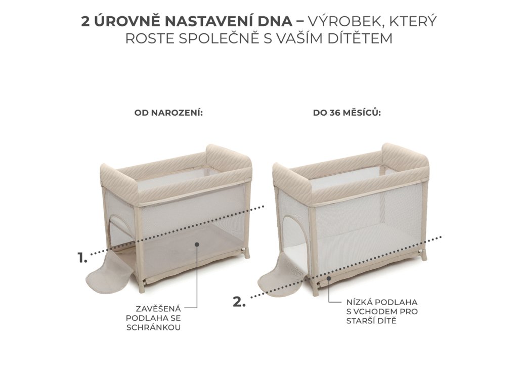 Vďaka zavesenému dnu bude mať vaše bábätko od prvých dní života pohodlný spánok a vám bude pohodlnejšie položiť vášho drobca na matrac. Otvorený východ a úložný priestor pod zavesenou základňou je dômyselným multifunkčným riešením na uloženie doplnkov alebo hračiek.