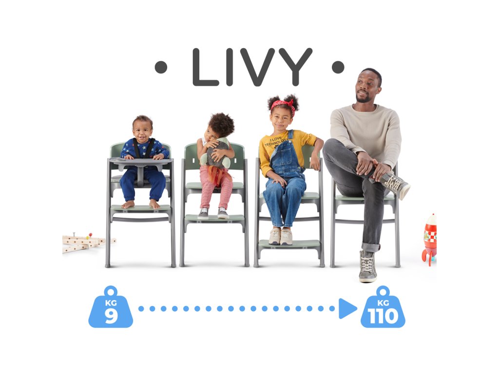 - stolička na celý život - lIVY bude dieťaťu slúžiť od 6. mesiaca života až do 110 kg. Budete si môcť na stoličku sadnúť s dieťaťom na kolenách.