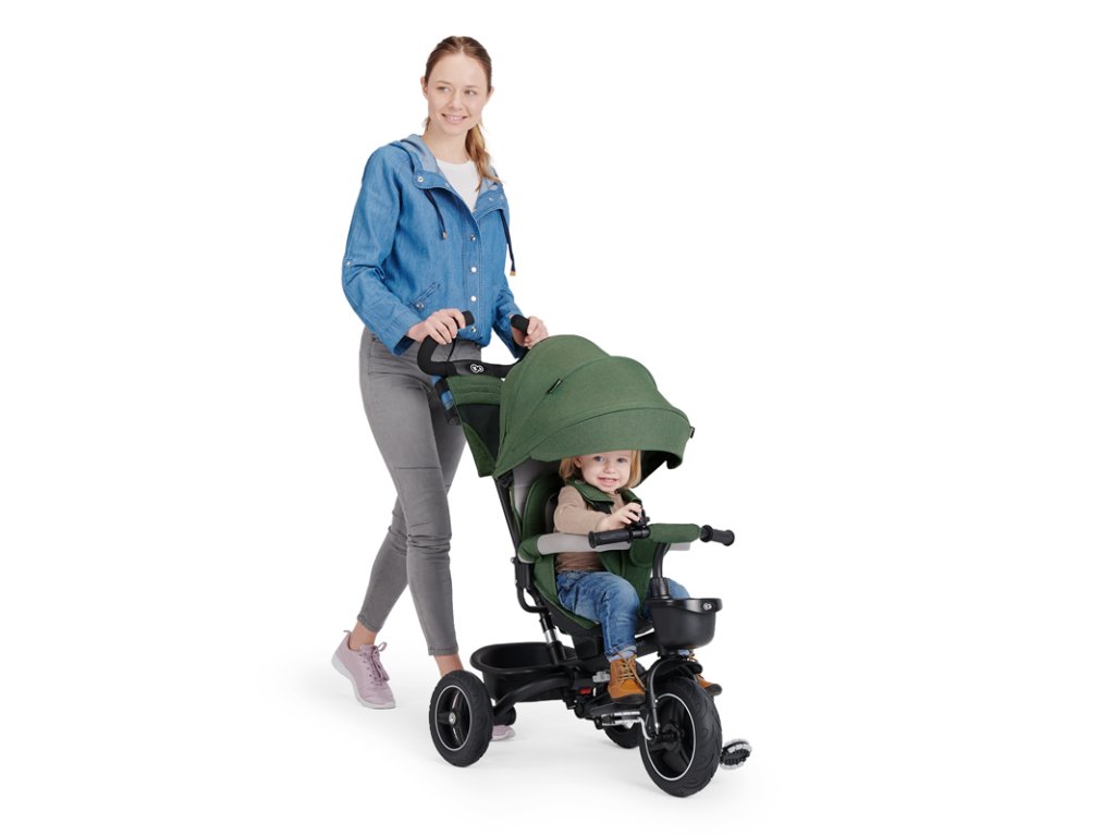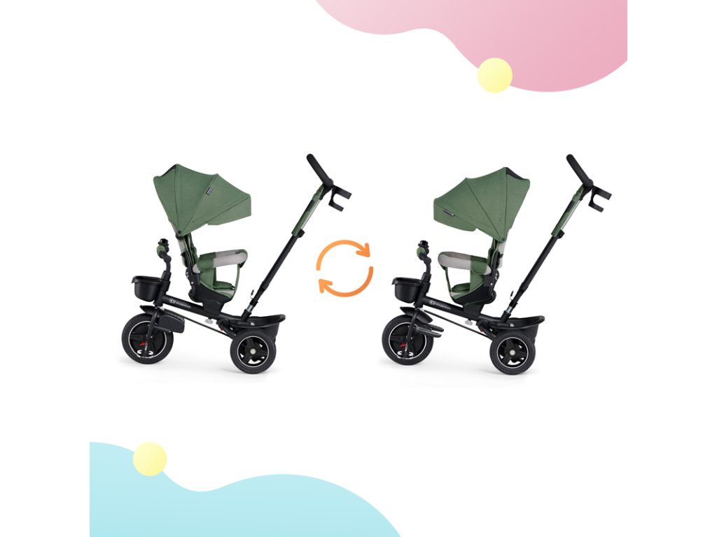 Bicykel má 360° otočné sedadlo, ktoré je možné umiestniť otočené k rodičovi alebo k smeru jazdy – dieťa sa bude cítiť istejšie a na začiatku vás bude mať na očiach. Komfortné sedadlo s mäkkým poťahom a vysokým operadlom bude dotvárať pohodlie jazdy, poskytuje tiež chrbtici primeranú oporu pri dobývaní sveta. Bicykel je vybavený trojbodovými pásmi a odnímateľným madlom, ktoré je možné odňať z trojkolky, keď je dieťa pripravené na samostatnú jazdu.
