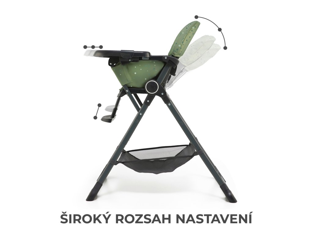 FOLDEE sa dá zložiť do kompaktnej veľkosti, čo umožňuje jednoduchú prepravu, napr. na dovolenku. Má široký rozsah nastavenia, ktorý umožňuje prispôsobiť stoličku výške dieťaťa. Má 3 polohy opierky chrbta a 2 polohy opierky nôh, takže Vášmu dieťatku poskytne nielen pohodlie, ale umožní mu aj zaujať správne držanie tela pri jedení. Pre pohodlnejšie jedenie je možné nastaviť podnos v 3 rozsahoch od sedadla.