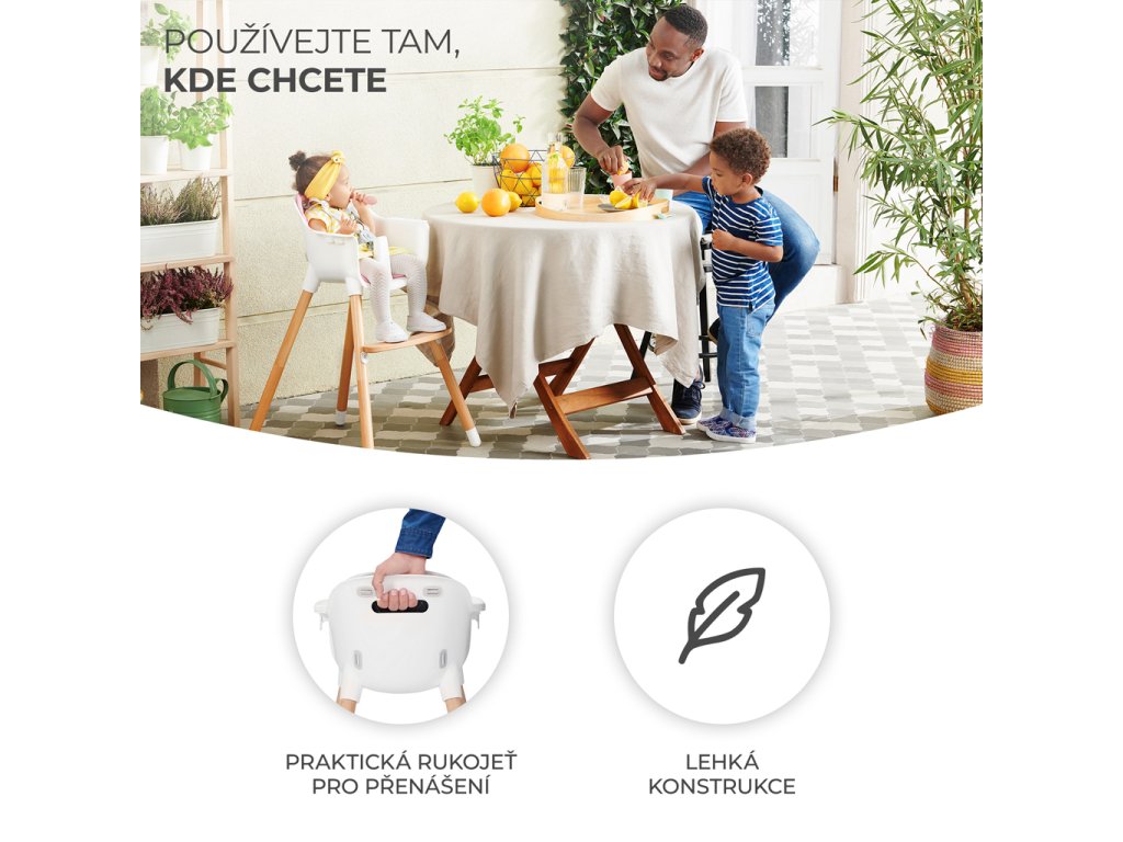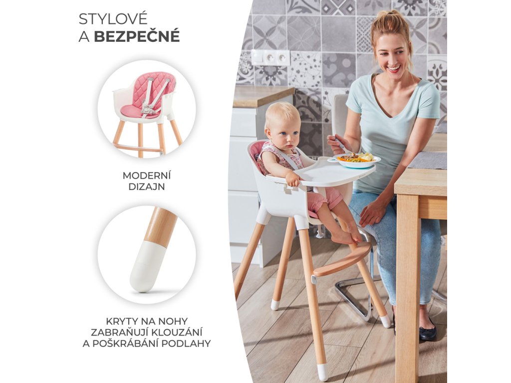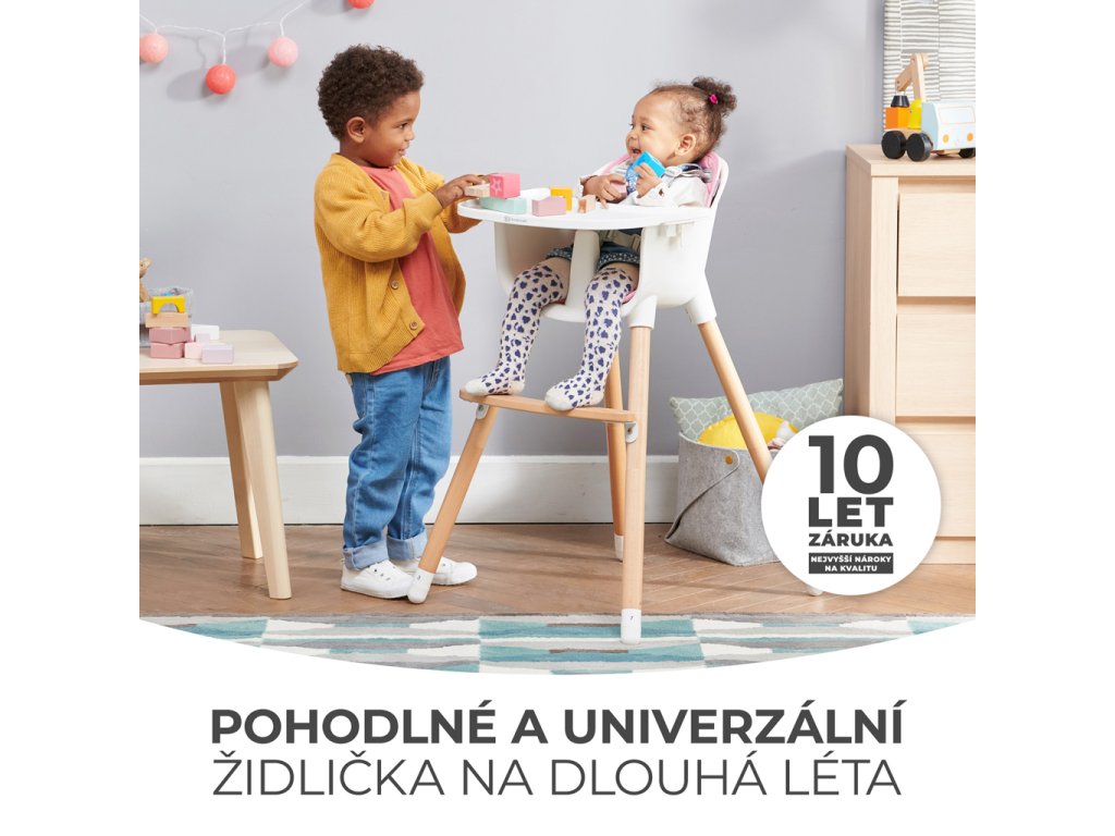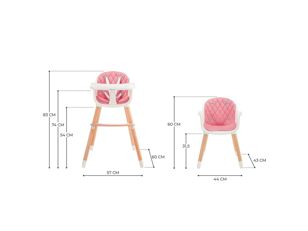 - 2 v 1 – Stoličky SIENNA môžu byť použité ako stoličky na kŕmenie i ako stoličky pre staršie deti. Stačí odskrutkovať nohy, odopnúť tácku a stolička pre staršie dieťa je hotové!