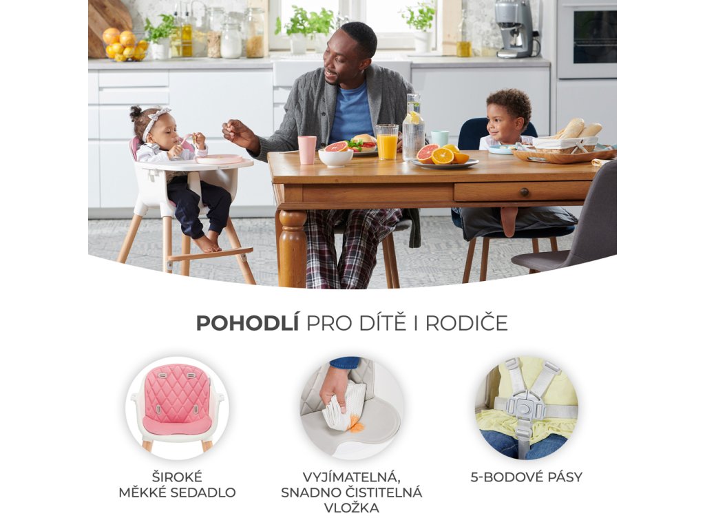 - Tácka sa dá ľahko odopnúť a umyť pod tečúcou vodou. Zvyšok stoličky je možné čistiť vlhkou handričkou.