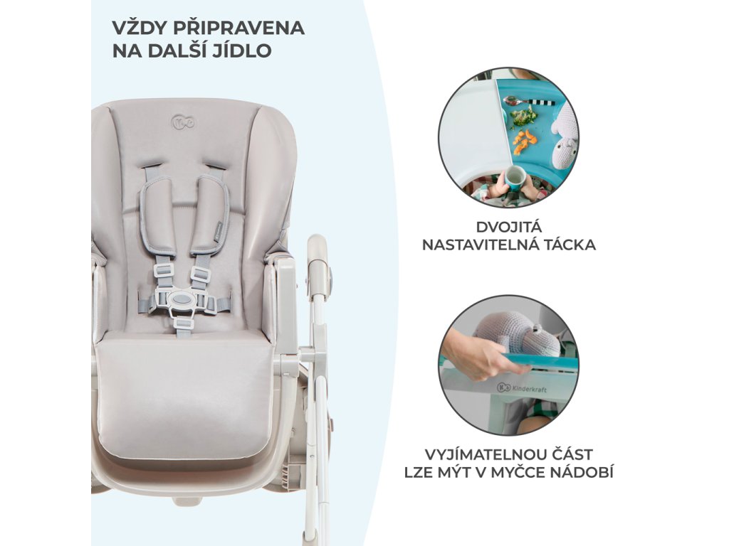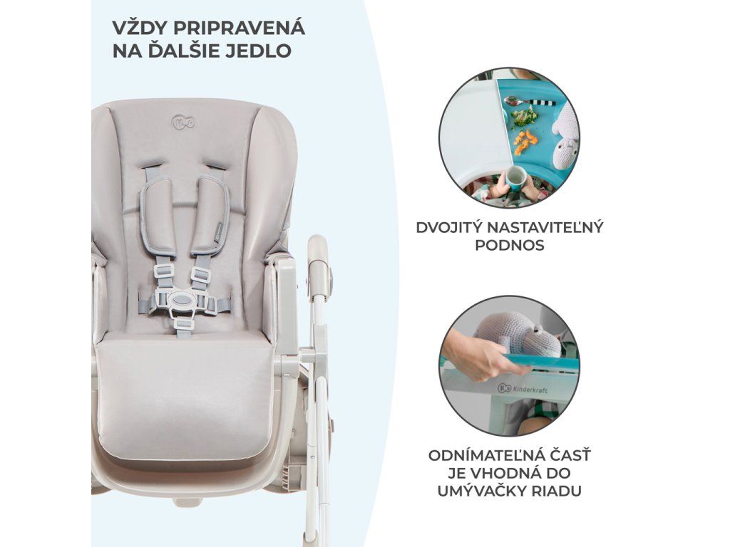- Nastaviteľná tácka - umožňuje ľahko usadiť dieťa do stoličky a nastaviť vzdialenosť tácky do 3 polôh. S prídavným dvojitým podnosom sa ľahko čistí.