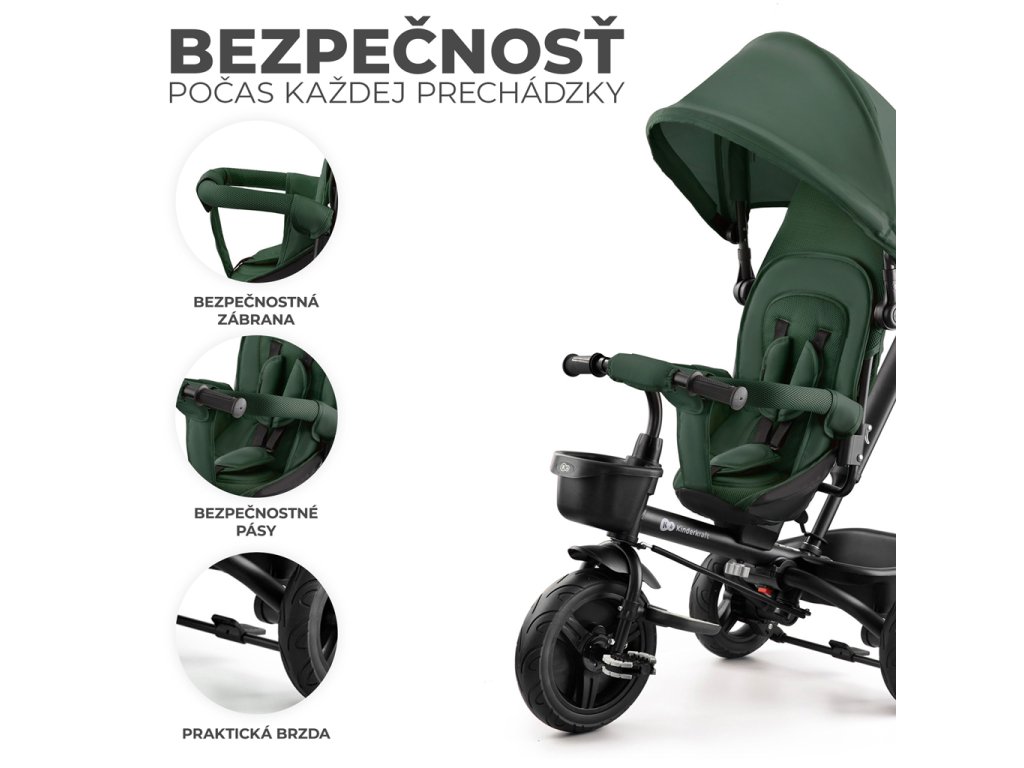 Trojkolka je vybavená nastaviteľnými, 3-bodovými bezpečnostnými pásmi a bezpečnostnou zábranou. Pásy majú mäkké chrániče a rozkrokový popruh sa dá jednoducho pripevniť k zábrane, aby sa zvýšila bezpečnosť vášho dieťaťa.