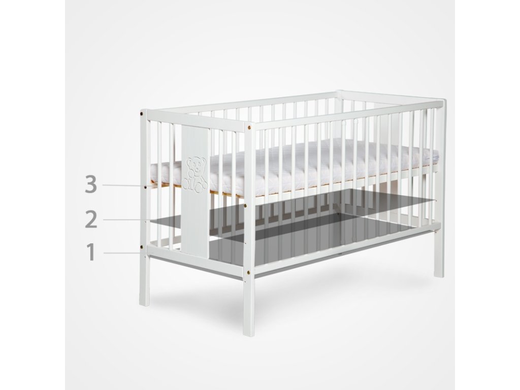 Stabilná detská postieľka s aplikáciou srdiečka vyrobená z materiálov: eco + MDF + borovicové drevo. Na kratšom boku postieľky je umiestnený znak informujúci o maximálnej hrúbke matraca, ktorý je možné použiť v najvyššej polohe lôžkovej plochy postieľky.